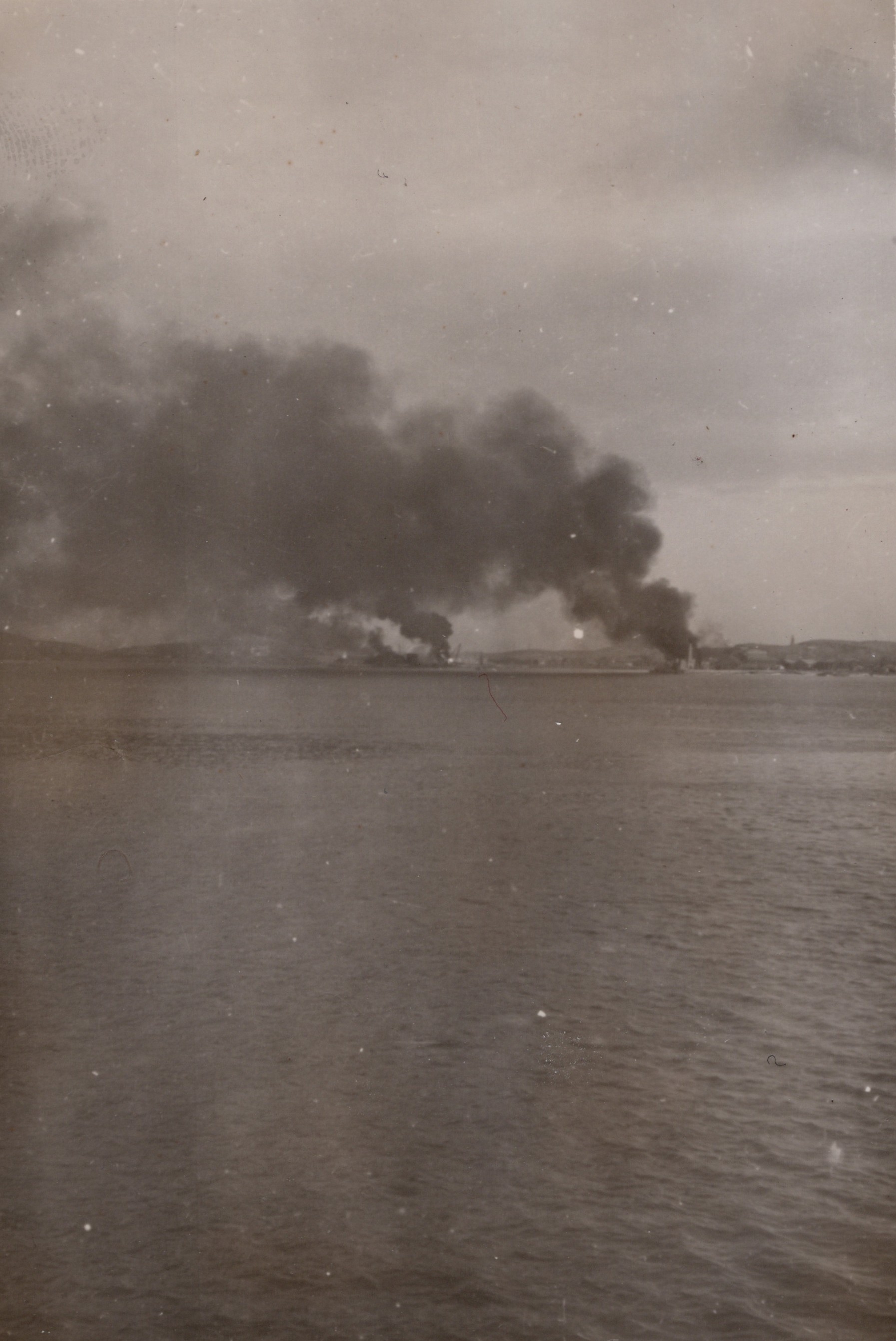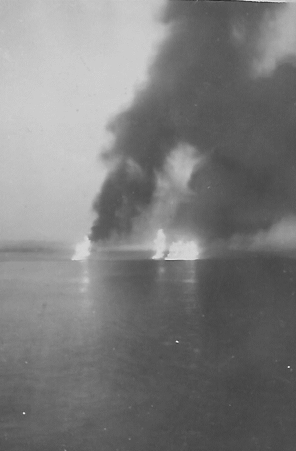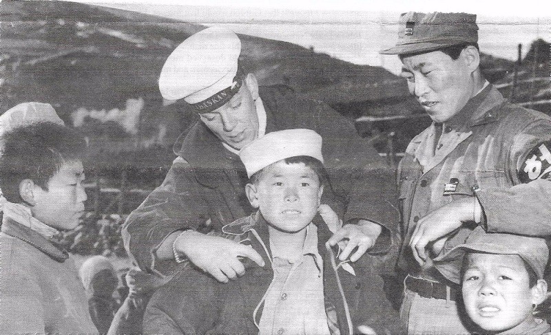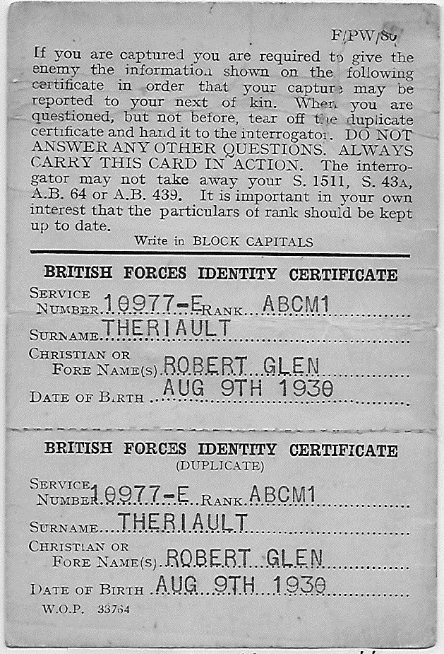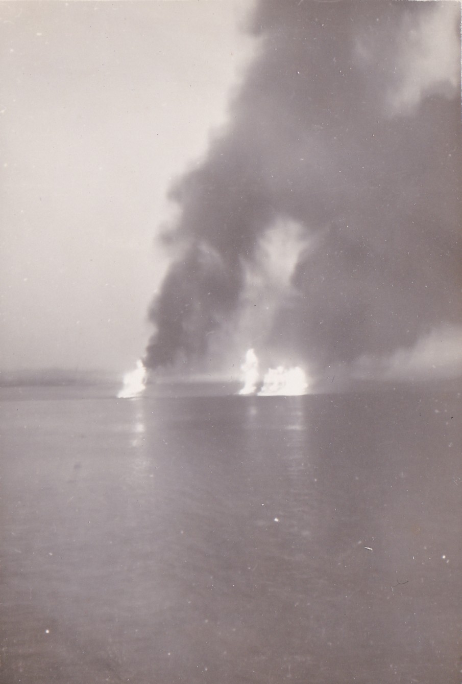 (BT048) HMCS CAYUGA off Korea - 1950 (BT049) Write-up on the withdrawal from Chinnampho, Korea (BT050) Fires set by CAYUGA gunfire - Chinnampho, Korea (BT051) British Forces Identity Certificate with instructions on what to do if captured (BT052) HMCS ATHABASKAN sailor with Korean children