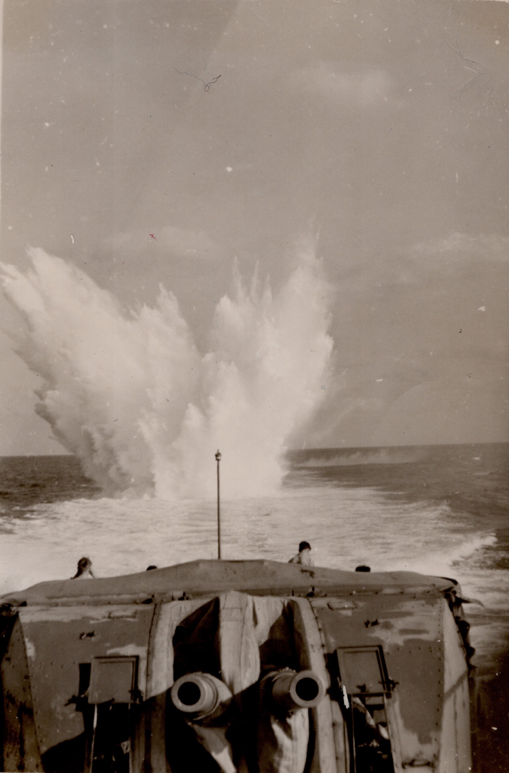 (NRT136) Depth charge away (NRT137) Depth charge exploding astern of HMCS CAYUGA (NRT138) Physical training (PT) on HMCS CAYUGA while enroute to Pearl Harbor (NRT139 - NRT140) Arrival at Pearl Harbor - last port visit before returning to Esquimalt - 1951