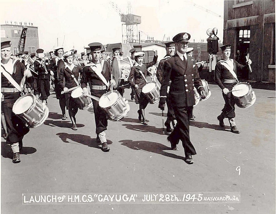 (CAY001) Band playing at the launching of HMCS CAYUGA R04 // Photo Credit: Hayward // Courtesy of Keith McDougall (CAY002) HMCS CAYUGA - undated (CAY003) HMCS CAYUGA R04 - 22 June 1948 // Photographer: Walter E. Frost. Source: City of Vancouver Archives (CAY004) HMCS CAYUGA'S Battle Honour board at the Royal Canadian Legion Br # 159, CAYUGA, ON // Courtesy of Neil Bell (CAY005) HMCS CAYUGA'S Wardroom Onboard / Ashore board at the Royal Canadian Legion Br # 159, CAYUGA, ON // Courtesy of Neil Bell