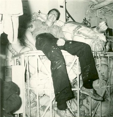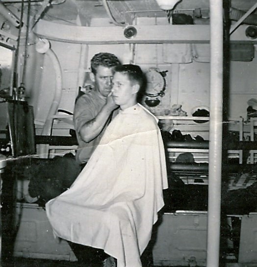 (CAY011) CANADIAN WARSHIPS IN ORIENT -- HMCS Cayuga (background) begins the departure of the Second Canadian Escort Squadron from Yokosuka, Japan, after a visit made during the current training cruise from Esquimalt, B.C., to the Orient. Other ports of call for the five destroyers escorts include Pearl Harbour, Tokyo, Saigon and Okinawa. In the foreground, preparing to slip, are the new DEs Skeena, Fraser and Margaree. The modernized destroyer escort Crescent is at far right rear. // Wednesday, April 2nd, 1958 Lunenburg Progress Enterprise, Wed., 02 Apr 1958, page 5 // Courtesy of Hugh Muir (CAY012) OSEMS Keith McDougall resting in the mick rack. After lower mess HMCS CAYUGA 1959 // Courtesy of Keith McDougall (CAY013) OSEMS Hainsworth getting a haircut from PO2 Caissie, 1959 // Courtesy of Keith McDougall (CAY014) Unknown sailor, after lower mess deck, HMCS CAYUGA, 1959 // Courtesy of Keith McDougall (CAY015) HMCS CAYUGA fueling from HMCS ONTARIO - 1957 // Courtesy of Stephen Hlasny