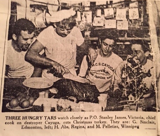 (CAY021) Alice, Mascot of HMCS CAYUGA // My first dog - Alice. She was apparently a cute little puppy when the crew adopted her. By the time I first met her she was a fully-developed cleaning stations PO. She was picked up as a stray by HMCS CAYUGA in Guam she started out as an OD (ordinary dog). Serving in the Korean War, she was promoted to AB, LS and eventually P2 (temporary-acting, while so employed). Her action station was below the X mount shelter. When she came ashore she moved in with our family. What most people don't know is that Alice needed a job. She spent her post-RCN days as the dog on the garbage truck in PMQs. She was NEVER late for supper. Courtesy of Dave Tyre // On the 2nd deployment to Korea, Alice also used the Gun Direction Room (GDR) as an "Action Station." Courtesy of Jim Tyre (CAY022) HMCS CAYUGA leaving for Korea from Esquimalt, British Columbia, Jun 1951 // Source: Canadian Naval Alumni page on Facebook // Credit: Peter Chance (CAY023) Christmas on HMCS CAYUGA 1951 // Sailors mentioned in the article - PO Stanley James of Victoria, BC; G. Sinclair of Edmonton, AB; H. Abs of Regina, SK; and, M. Pelletier of Winnipeg, MB // From the collection of Harold Abs. AB.RP, RCN // Courtesy of Donna Abs (CAY024) This is a photo and caption from a 1952 edition of The Crowsnest. At the time, it looked like a great story. HMCS CAYUGA'S medical officer performed emergency surgery on the ROK soldier and saved him. Only one little problem: CAYUGA'S surgeon-Lt. Sears was, in fact, Ferdinand Waldo Demara - The Great Imposter. // Courtesy of Dave Tyre (CAY025) Getting ready for Christmas aboard HMCS CAYUGA during the Korean war // Courtesy of the CFB Esquimalt Naval and Military Museum