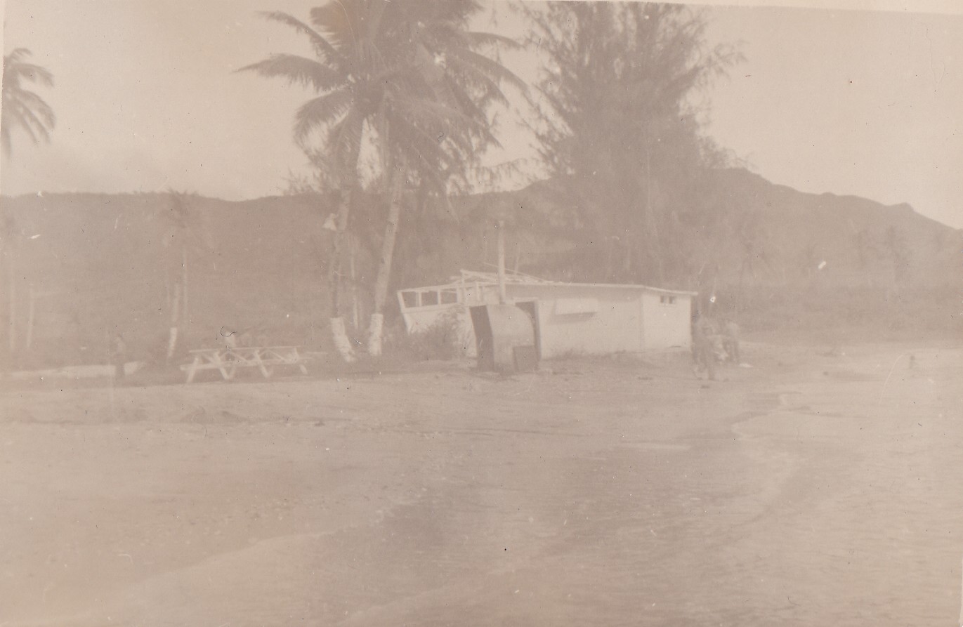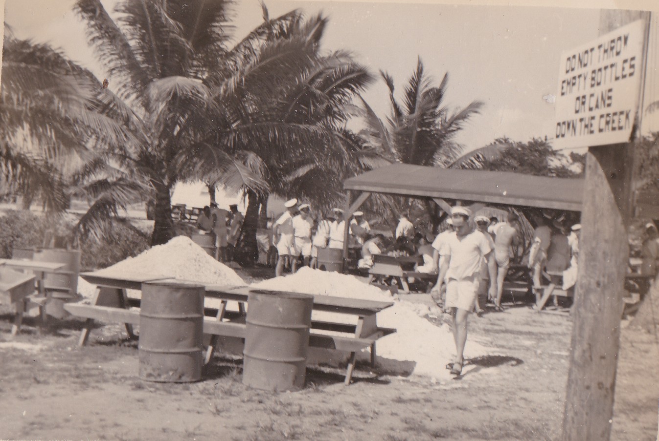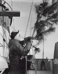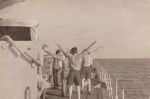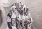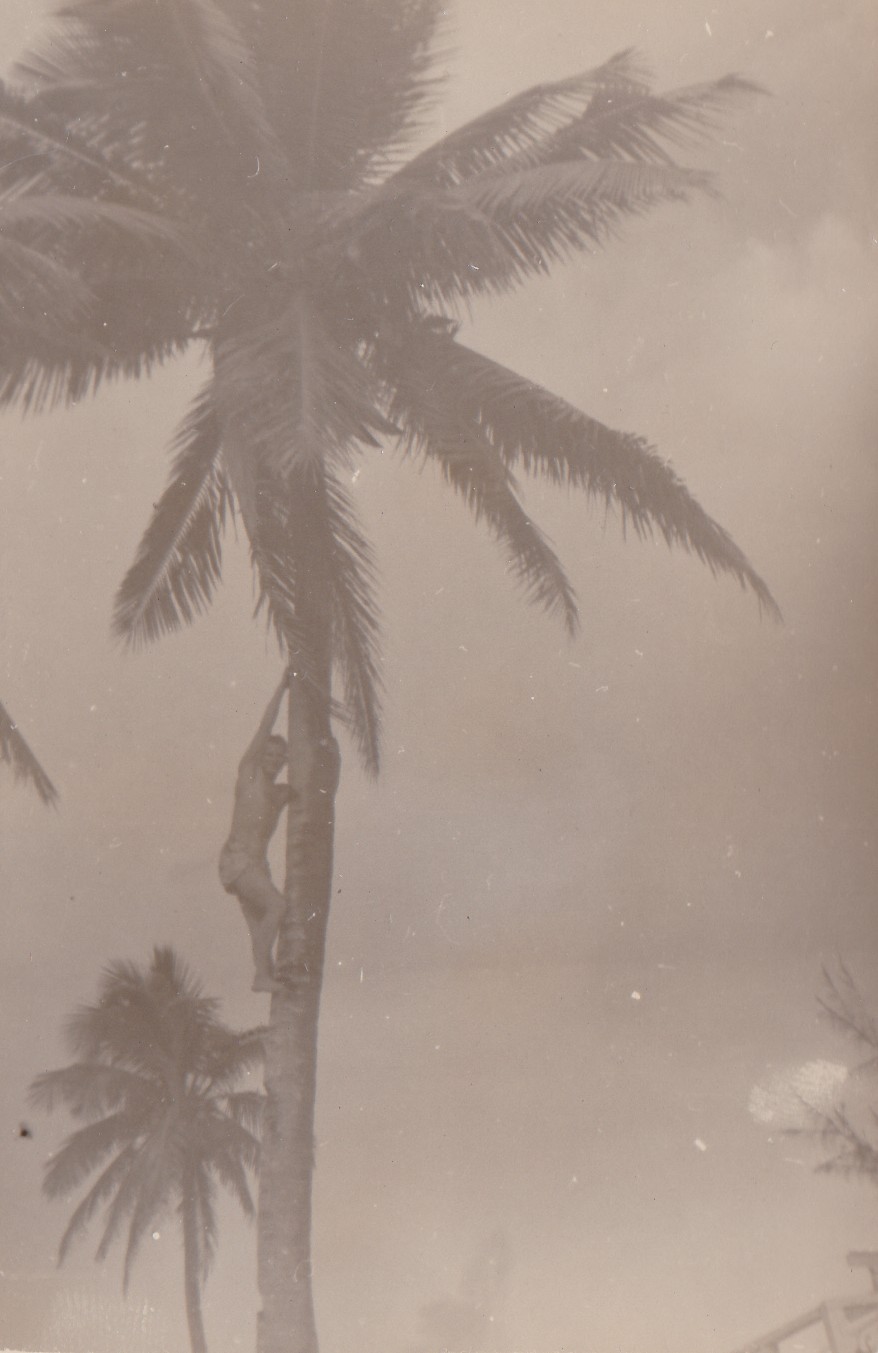 (NRT016) Hoover Beach, Guam (NRT017) Beer party at Hoover Beach, Guam (NRT018) Native climbing Coconut palm tree (NRT019) Leaving Guam - HMCS CAYUGA in the foreground (NRT020) American carrier seen through a scuttle on CAYUGA, Sasebo, Japan