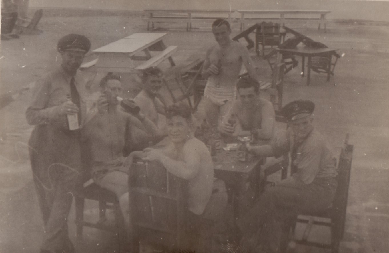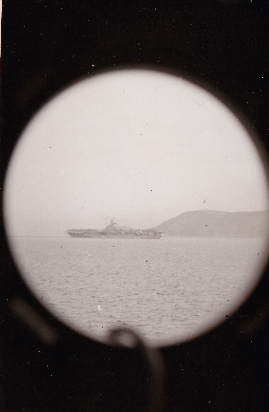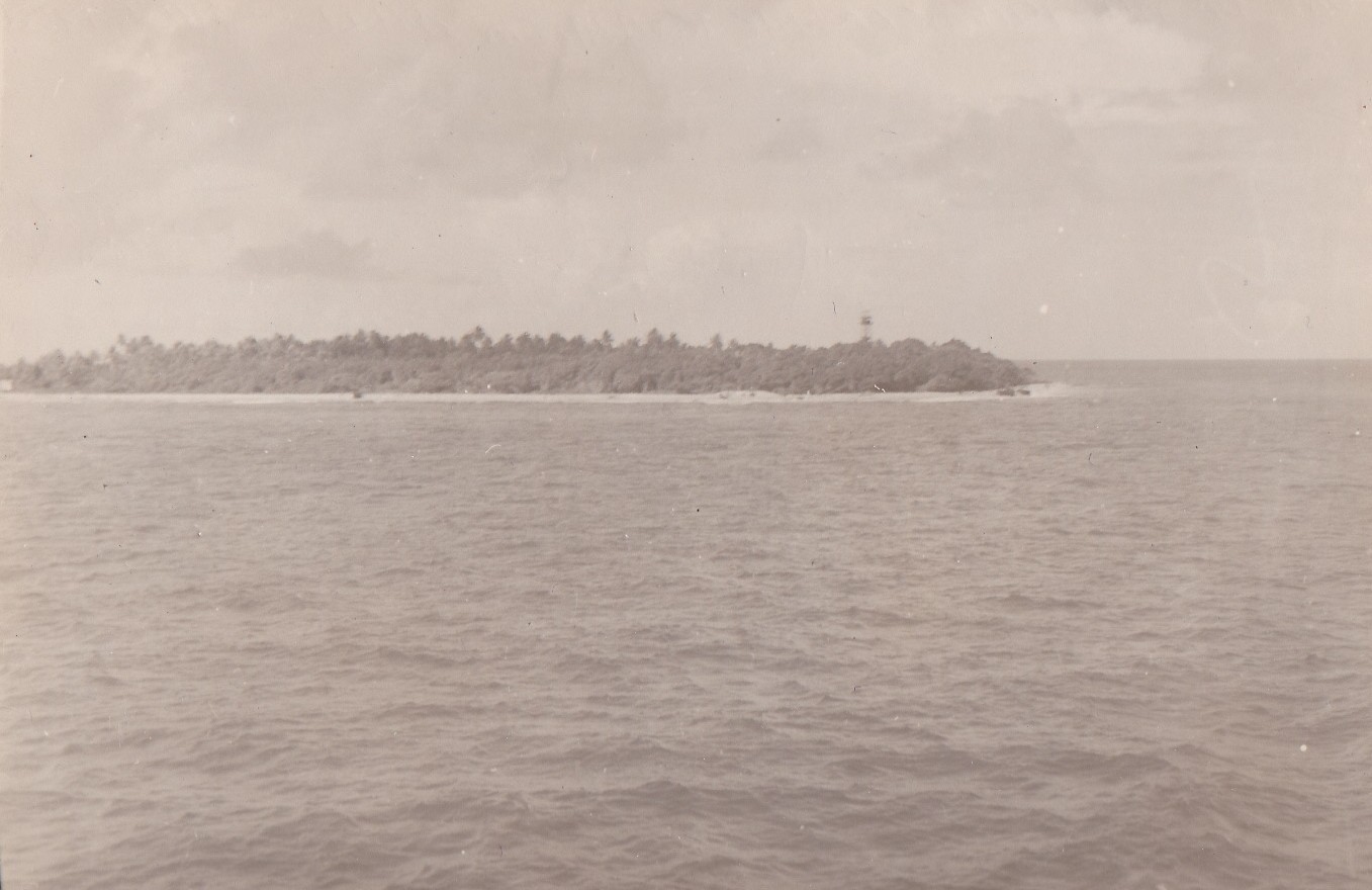 (NRT016) Hoover Beach, Guam (NRT017) Beer party at Hoover Beach, Guam (NRT018) Native climbing Coconut palm tree (NRT019) Leaving Guam - HMCS CAYUGA in the foreground (NRT020) American carrier seen through a scuttle on CAYUGA, Sasebo, Japan