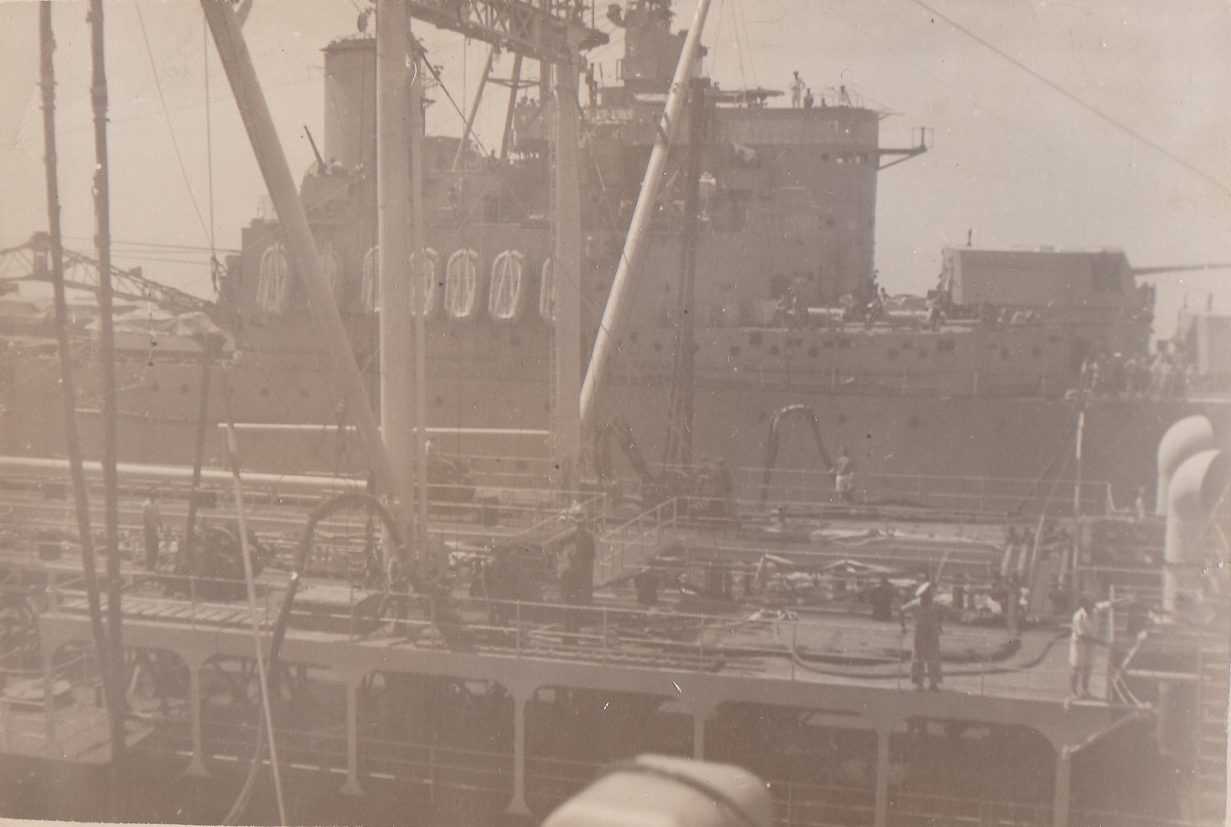 (NRT071) Oyster Farm (NRT075) HMCS CAYUGA conducting a RAS on the starboard side of a tanker with a unknown cruiser on the port side of the tanker
