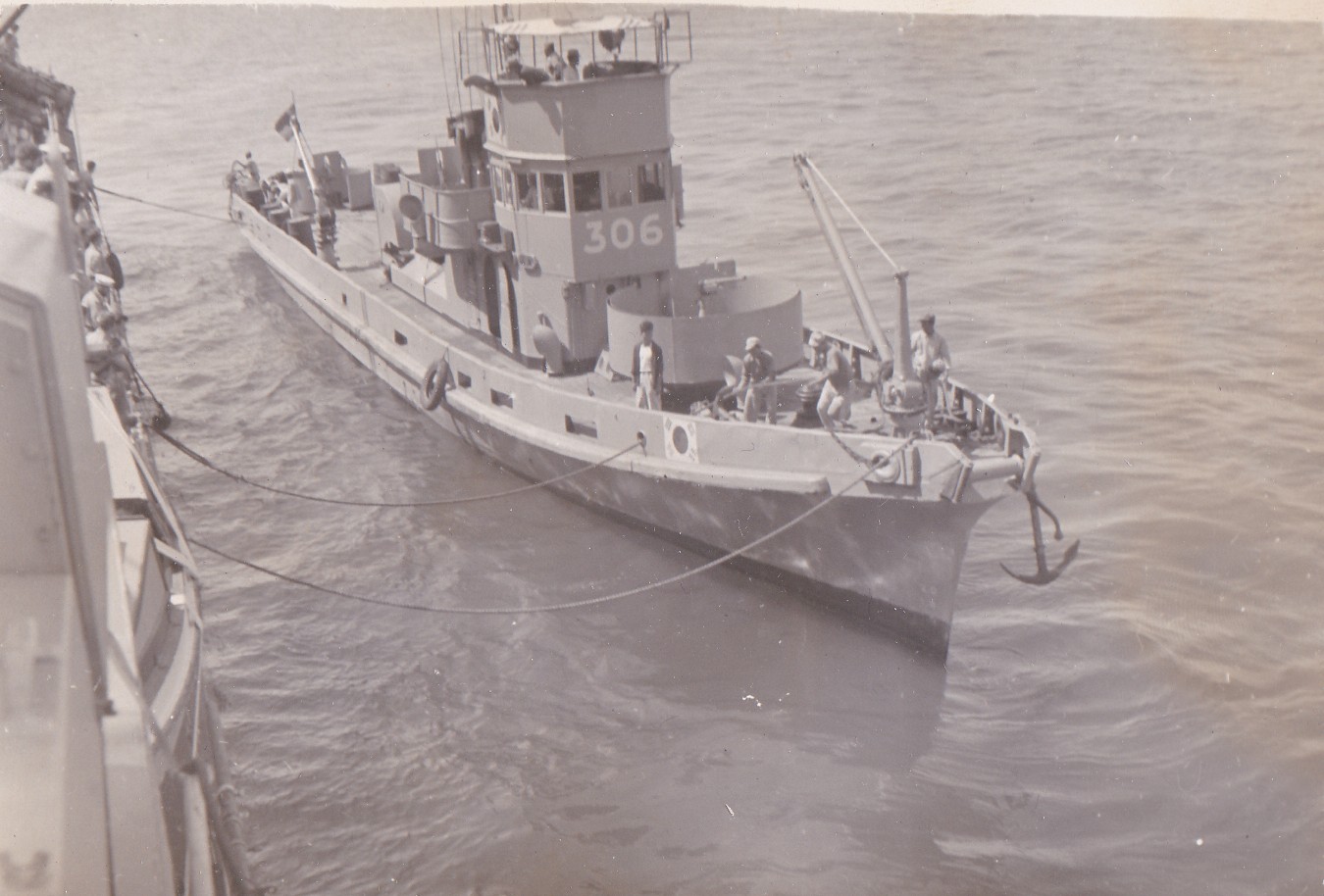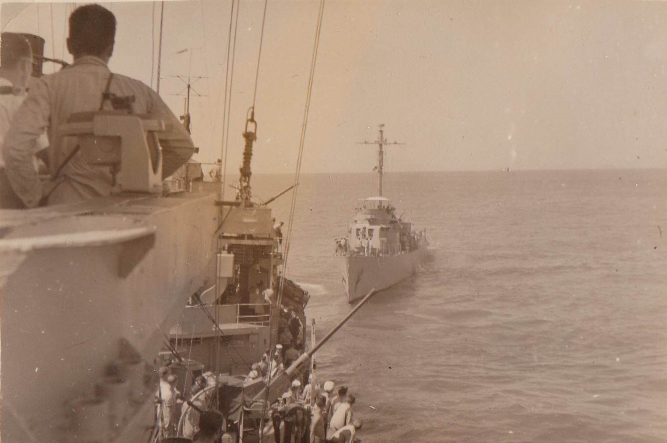 (NRT076) ROK gunboat coming alongside HMCS CAYUGA. ROK vessel Danyang JMS 306 was an ex-Japanese mine-planting vessel (NRT077) Unknown ship approaching HMCS CAYUGA - possibly ROK