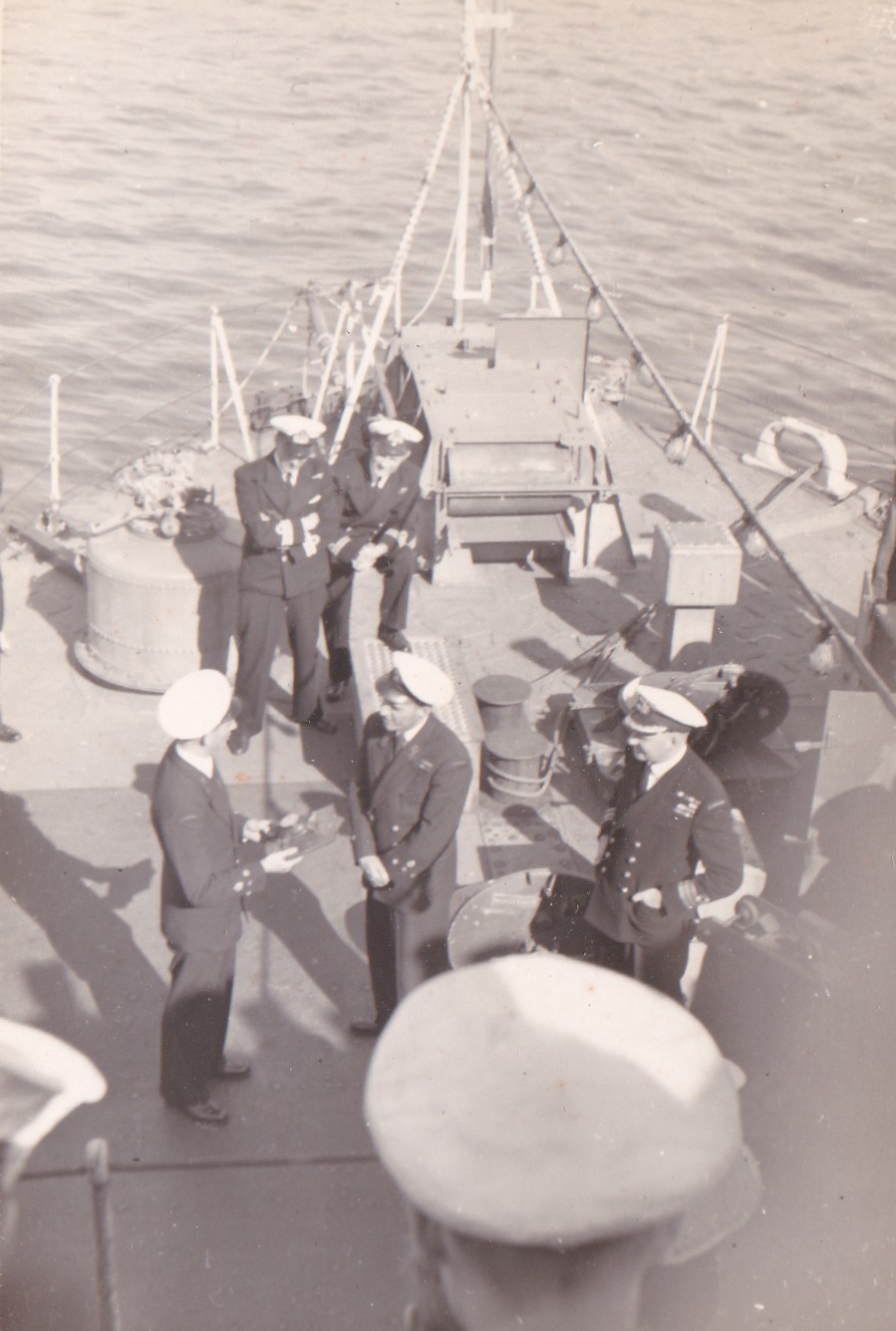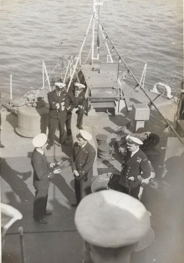 (JGW001) Four Tribal class destroyers in HMC Dockyard, Halifax c1959-60 // RCN Photo (JGW002) Unknown 4 ringer visiting HMCS CAYUGA. Cdr Petley Jones, CO saluting, with telescope under his left arm c1959-60 // RCN photo (JGW003) There is something very interesting about this hatch .... LCdr Garn Wright 2nd from right c1959-60 // RCN photo From the collection of Garn Wright, Cdr, RCN Courtesy of Peter Wright