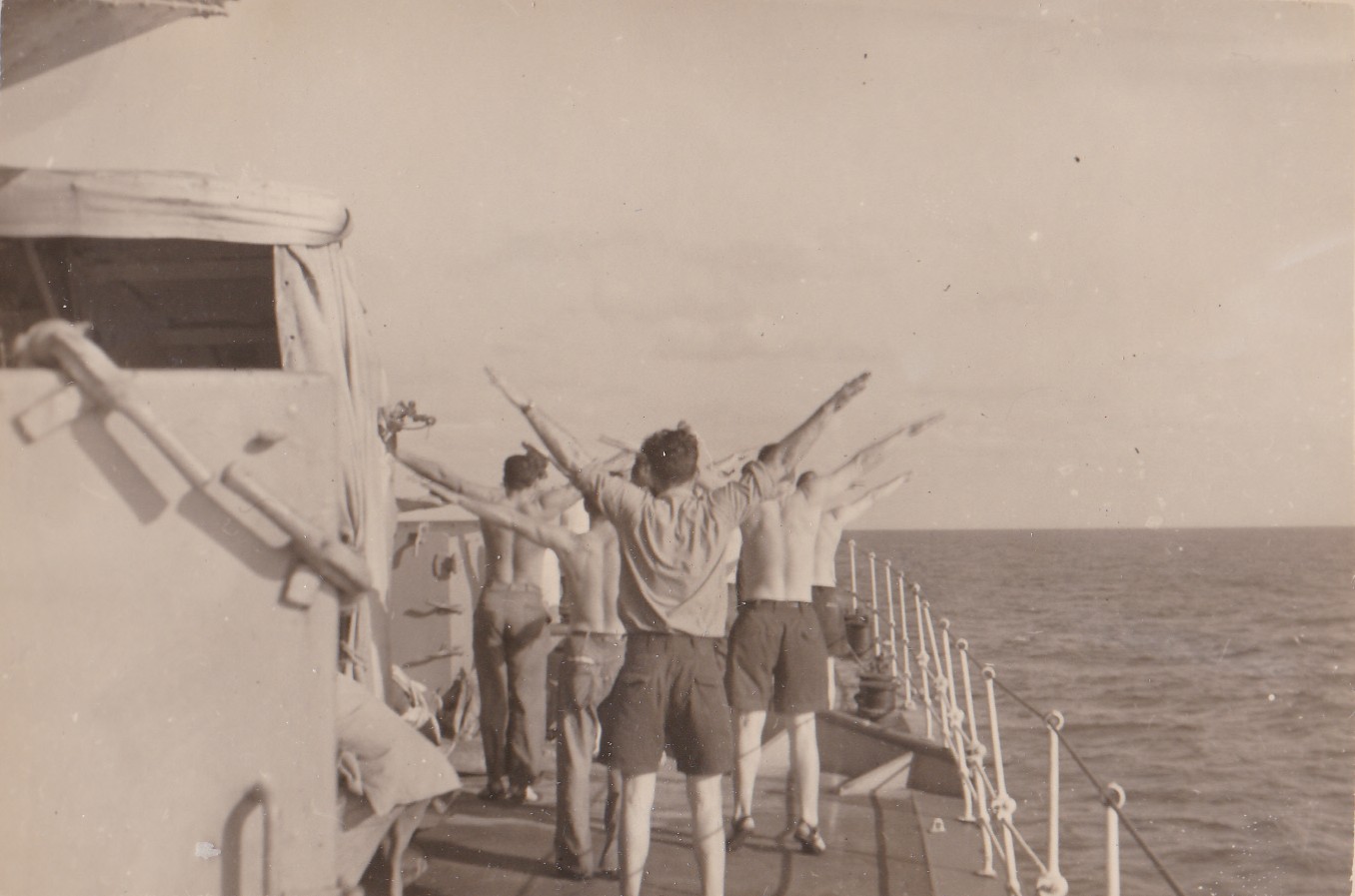 (JAT006) Don Deane and Dan McKee lounging on fo'c's'le of HMCS CAYUGA at Sasebo, Japan, 1950-51 (JAT007) Willie Doherty on HMCS CAYUGA 1950-51 (JAT008) Red Robinson on the twin 40 mm, HMCS CAYUGA, Korea, 1950-51 (JAT009) Jim Tyre painting ship on HMCS CAYUGA 1951-52 (JAT010) (L-R) George Johnson, Jim Tyre, Don Deane, RN sailor off HMS Alacrity, Bob Marcus in Hong Kong 1950