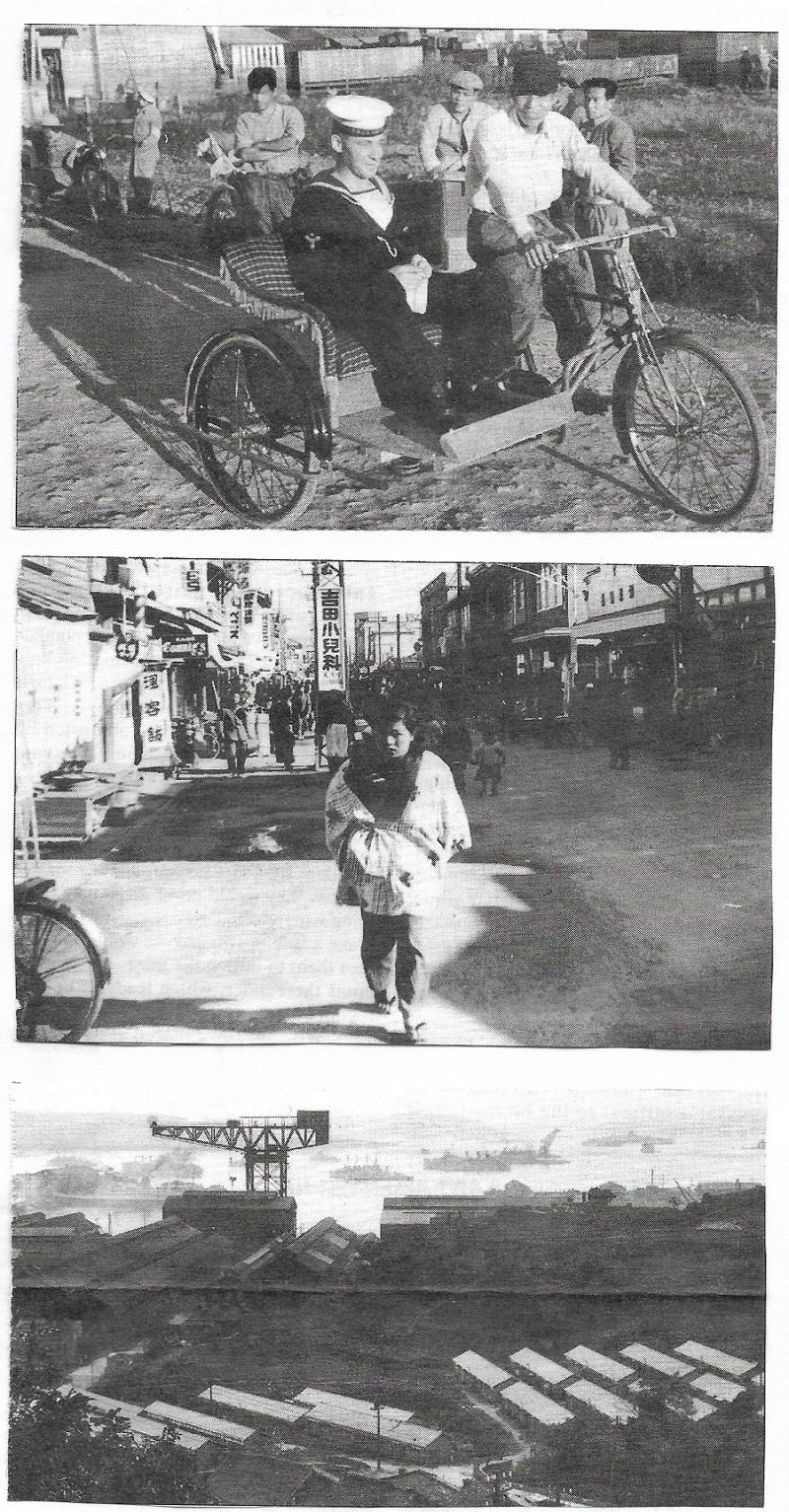 (BJB011) Ammunition barge at Sasebo, Japan (BJB012 - BJB013) Liberty barge, Sasebo, Japan (BJB014) Rickshaws at the fleet landing (BJB015) Baseball park