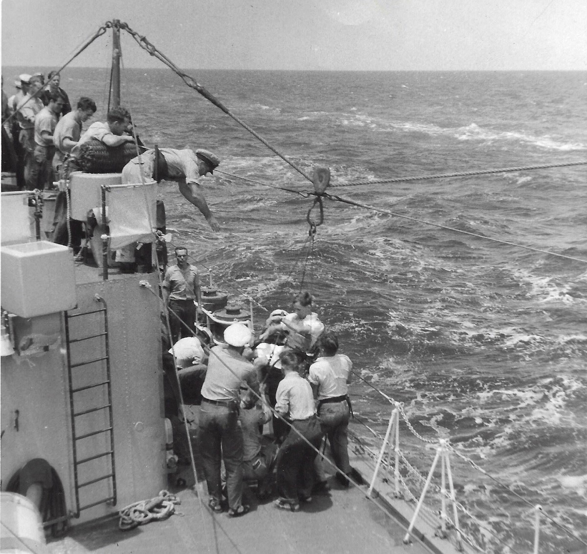 (CAY016) This is the crew of the director which ranged and pointed HMCS CAYUGA'S guns during the destroyer's bombardment of communist shore batteries at Inchon in February. Left to right are PO James Brahan, Vancouver; CPO John R. Ross, Vancouver; PO Stuart Butterworth, Edmonton; Lieut. Michael Martin, Kingston, Ont., and PO Ken Rae, Calgary. // Source: CROWSNEST Magazine, Vol. 3, No. 5, April, 1951 (CAY017) Royal Canadian Navy Tribal class destroyer HMCS CAYUGA 218 receives a jackstay transfer of supplies from HMAS Sydney III R17 during a Replenishment at Sea // Source: Australian War memorial (CAY018) HMCS CAYUGA 218, one of HMAS SYDNEY'S escorting destroyers in the distance. In the foreground is a Firefly on SYDNEY'S flight deck // Source-credit: Imperial War Museum CAY019) Flight deck of HMCS SYDNEY // Source-credit: Imperial War Museum (CAY020) Alice, mascot of HMCS CAYUGA // Source: CROWSNEST Magazine Vol. 2, No. 12, Oct 1950