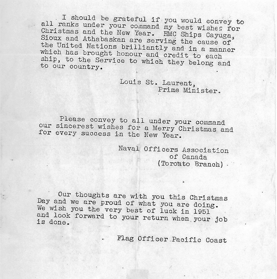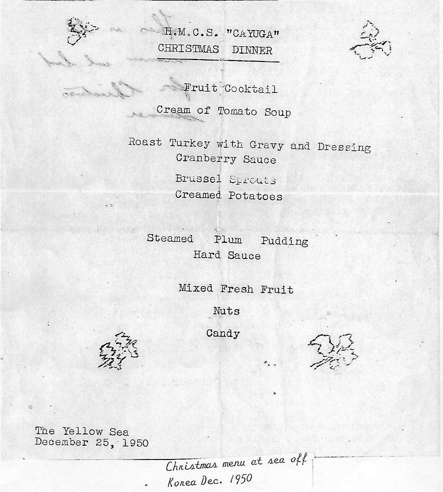 (BT068) Personnel transfer via jackstay (BT069) Christmas greetings to the RCN ships deployed off Korea - 1950 (BT070) HMCS CAYUGA'S Christmas Dinner Menu - Dec 1950 (BT071) HMCS CAYUGA transiting ice field off Korean coast (BT072) Lookout on watch on HMCS CAYUGA while transiting ice field off Korean coast