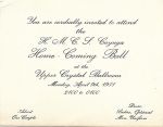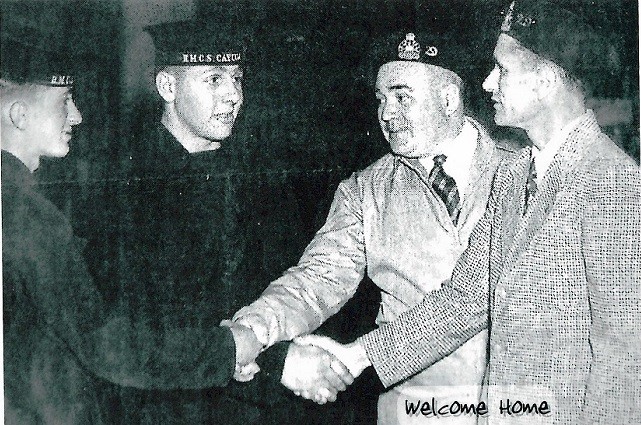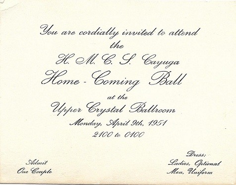 (BT077) Bud Theriault (right) and Dick Malette getting off the train in Creston, BC after CAYUGA'S Korean War tour (BT078) Welcome Home! Dick Malette and Bud Theriault arrive home in Creston, BC (BT079) Veterans welcome Bud Theriault and Dick Malette home (BT080) Invitation to a Home Coming Ball for HMCS CAYUGA From the collection of Robert (Bob) (Bud) Theriault, Petty Officer 1st Class Signalman, RCN Courtesy of Bob Theriault