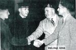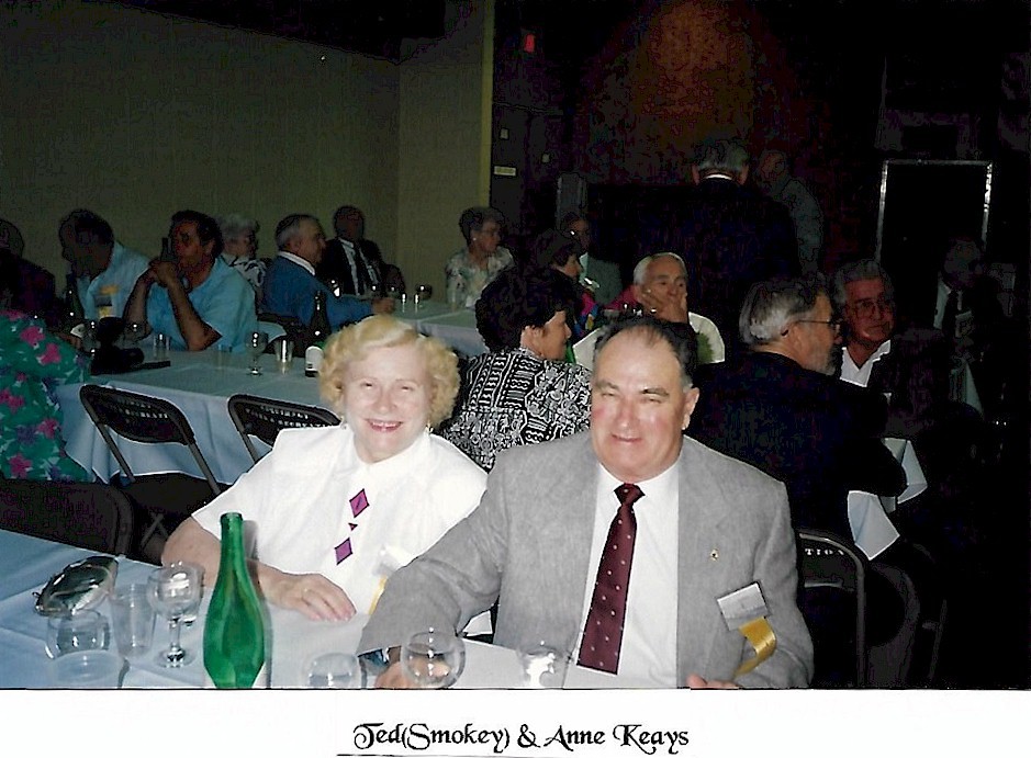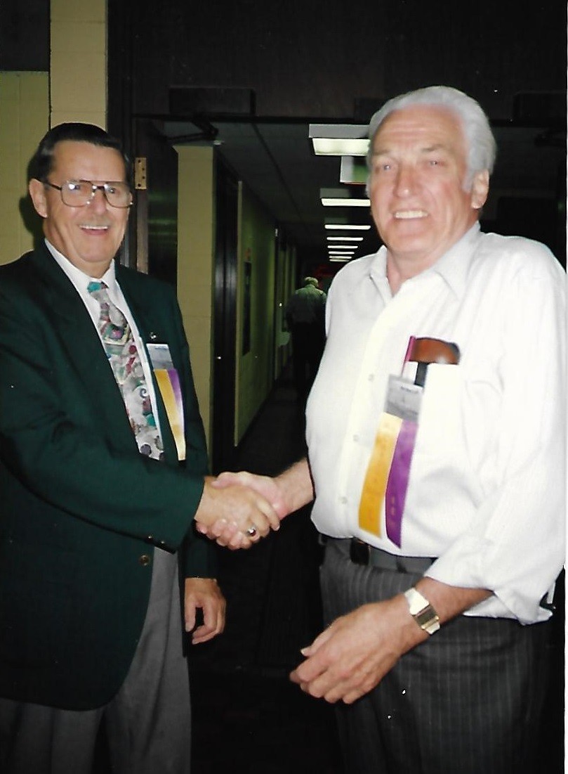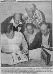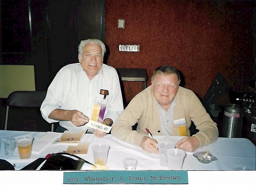 (CR-05) John Radley (left) and Roy Wheeler (CR-06) Roy Wheeler (left) & Douglas McKeown (CR-07) Newspaper article on the reunion. Alumni in photo: Tom Little, Elmer Ferguson, Roy Fraser, Ted Parham and Ted Meyers (CR-08) Reunion napkin and souvenir ribbon