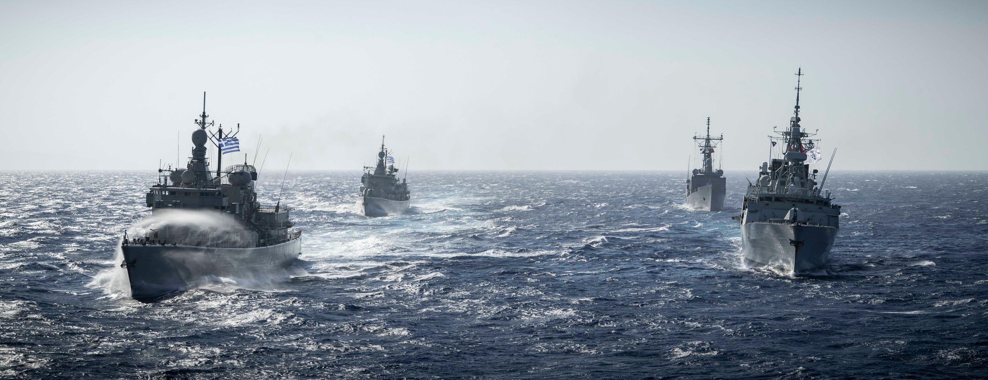(CHN015) HMCS Charlottetown, Flagship of Standing NATO Maritime Group Two, sails with consort ships Turkish Naval Ship TCG Gaziantep, Greek Naval Ships HS Limnos and HS Nikiforos Fokas conduct operational patrols in the Aegean Sea during Operation REASSURANCE on 19 July 2024 // Photographer: Aviator Gregory Cole, CF Photo