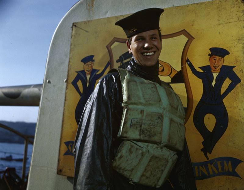 (EMS005) Seaman Enio Girardo by the gun mount on HMCS EDMUNSTON after having been washed overboard in a storm and rescued by his shipmates on 31 Oct 1943 (EMS006) Kodachrome. Able Seaman Enio Girardo of the corvette HMCS EDMUNDSTON (K106), who was rescued by his shipmates after being washed overboard in a storm at sea. St. John's, Newfoundland, 13 October 1943. // Credit: Lt Gerald M. Moses, RCN Photographic Section Source: Library and Archives Canada (EMS007) AB Enio Girardo taking with the ship's boats crew after his rescue: L-R: AB Bill Miller, RCNVR of Windsor, ON; LS George Doutaz, RCN of New Westminster, BC; AB Giraro of New Westminster, BC; AB Ed Turner, RCNVR of Leamington, ON and LS BIll Brookbanks, RCN of Windsor, ON.