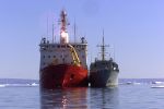 (GBY006) HMCS Goose Bay refueling with the Coast Ship the Pierre Radisson during OP NARWHAL - 03 Aug 2002 // RCN image # HS022502d22 (GBY007) HMCS GOOSE BAY 707 passing by an iceberg - 07 Apr 2003 // RCN image # HS030260d01 // Old neg. no. HS2002-0434-10. (GBY008) HMCS GOOSE BAY 707 passing Jetty NB, HMC Dockyard, Halifax, NS - 14 Aug 2003 // Photographer: MCpl Colin Kelley, Formation Imaging Services, Halifax, Nova Scotia // RCN image # HS030699d25 (GBY009) HMCS GOOSE BAY circa 2005 // Photo of HMCS GOOSE BAY 707 taken from SHAWINIGAN 704 during the 2005 Loyal Mariner trip. We hit a peak of over 13M waves during a storm on our way to the Azores. At the height of the storm we rolled to 39 degrees and our props came out of the water and both shafts tripped causing a Engineering Emergency. The sweepdeck was under water as we rolled, almost causing a number of ships crew to be washed over the side while they were out on deck securing equipment. We got the shaftlines up and carried on. // Courtesy of Rick Bungay (GBY010) HMCS Goose Bay and the Coast Guard ship Henry Larson rest at anchor after the completion of OP LANCASTER, Pond Inet, Baffin Island - 21 Aug 2006 // Photographer: Sgt Dennis Power, Army News, CFB Shilo // DND-CAF image # AS2006-0515d