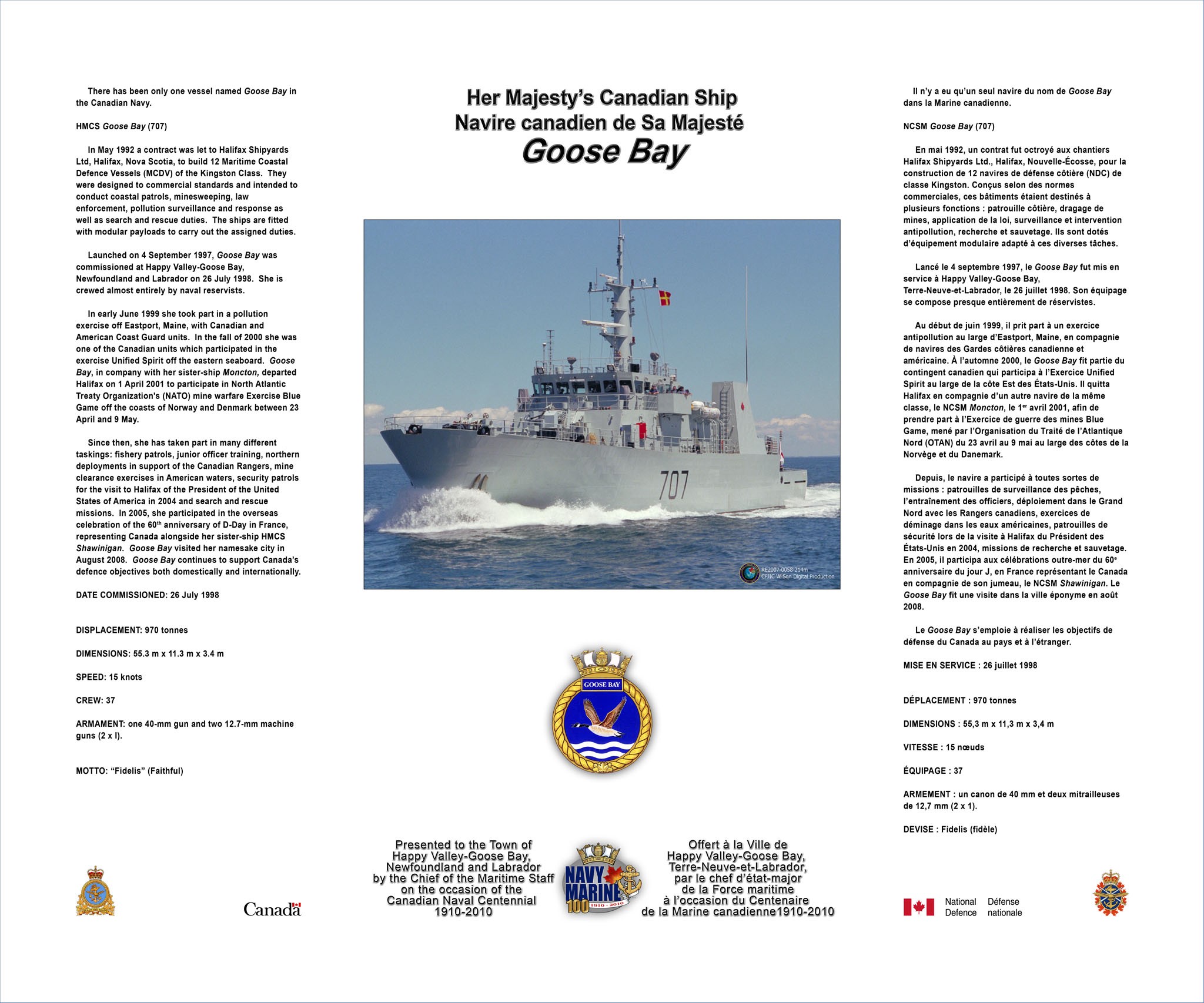 (GBY011) HMCS GOOSE BAY 707 taking part in a Photo Ex off Shearwater, Nova Scotia 02 Aug 2007 // Photographer: MCpl Carrie H. Roy, Formation Imaging Services, Halifax, Nova Scotia // RCN image # SW2007-00288-25 (GBY012) HMCS MONTREAL 336 and HMCS GOOSE BAY 707 shortly after departing St. John's, Nfld for OP NANOON 2010 - 03 Aug 2010 // Photographer: Corporal Rick Ayer, Formation Imaging Services, Halifax, Nova Scotia // RCN Image # HS2010-H001-017 (GBY013) Contents of frame plaque presented to the town of Happy Valley-Goose Bay, Newfoundland and Labrador in 2010 on the 100th anniversary of the creation of the RCN. // RCN image # RE2007-0058-214m (GBY014) HMCS GOOSE BAY 707, the French tall ship L'Hermione and Nova Scotia's own Bluenose II, sail in to Lunenburg, NS, 18 Jul 2015 // Photographer: LS Dan Bard, Formation Imaging Services Halifax // DND/RCN Photo. Crown Copyright 2015 (GBY015) HMCS GOOSE BAY 707 participating in the sail past at Halifax at the start of Exercise Cutlass Fury - 12 Sep 2016 // Courtesy of Clarence Hemeon