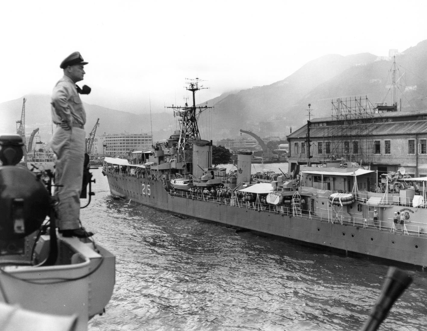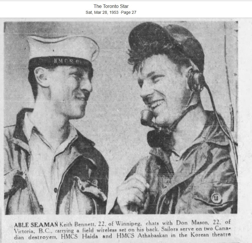 (HDA110) AB Keith Bennett, 22, of Winnipeg, chats with Don Mason, 22, of Victoria, B.C., carrying a field wireless set on his back. Sailors serve on two Canadian destroyers, HMCS Haida and HMCS Athabaskan in the Korean theatre (HDA111) HMCS HAIDA arrives at Sasebo, Japan 05 Feb 1954 during her 2nd Korean War Tour // HMCS HAIDA National Historic Site on facebook (HDA112) HMCS HAIDA 215 // From the collection of Gordon Arnold (Art) Broster // Courtesy of Cathy Robinson (HDA113) HMCS HAIDA 215 (HDA114) HMCS HAIDA 215 - RCN photo