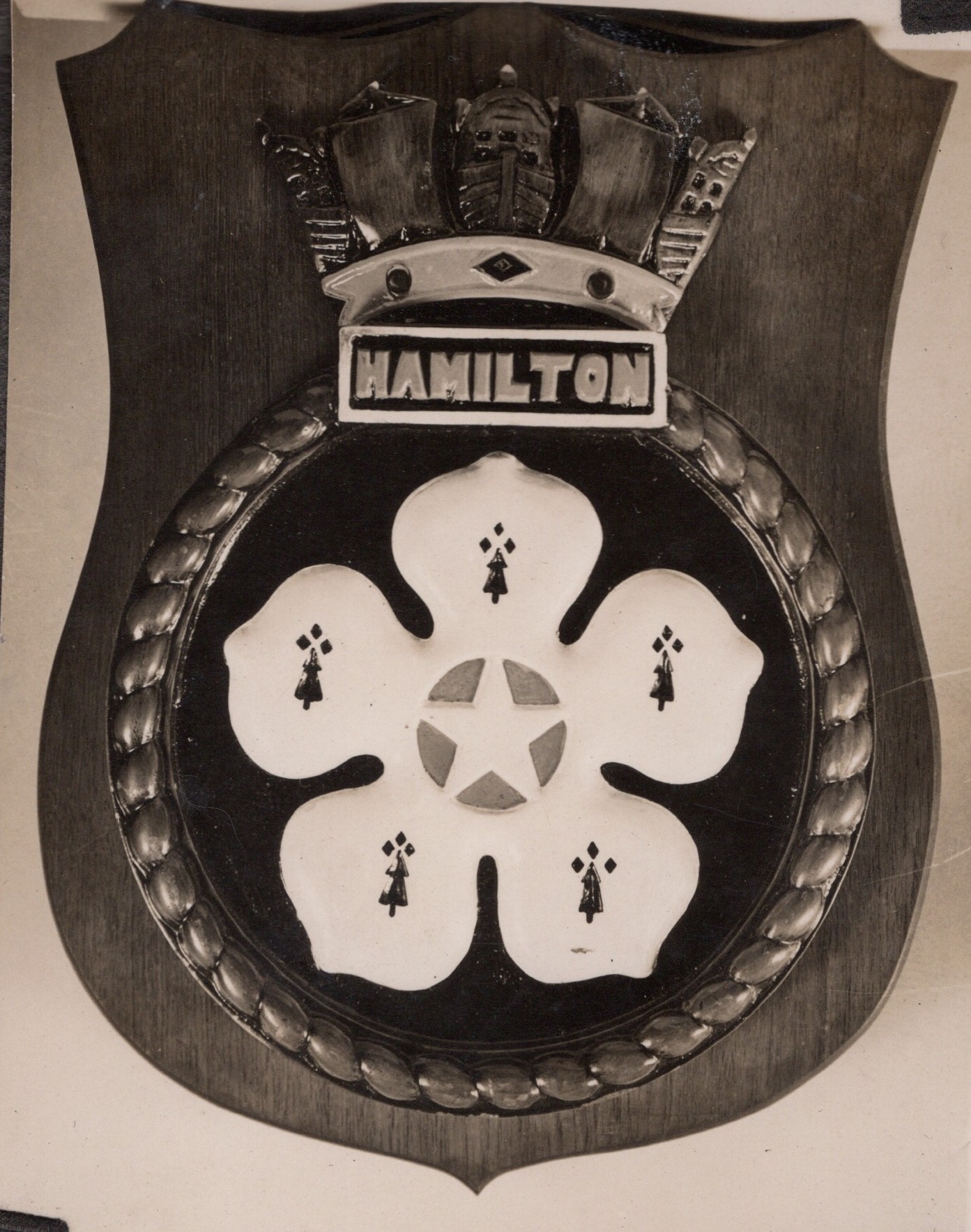 (JNC038) Ship's badge of HMCS HAMILTON I24 (JNC039) The ship's bell and badge of HMCS HAMILTON I24 (JNC040) James Cox (right) with unknown Chief Petty Officer on HMCS HAMILTON I24 (JNC041) James Cox (right) with unknown Chief Petty Officer on HMCS HAMILTON I24 - with a Fairmile Motor Launch in the back ground. (JNC042) Unknown sailors in a mess deck on HMCS HAMILTON I24