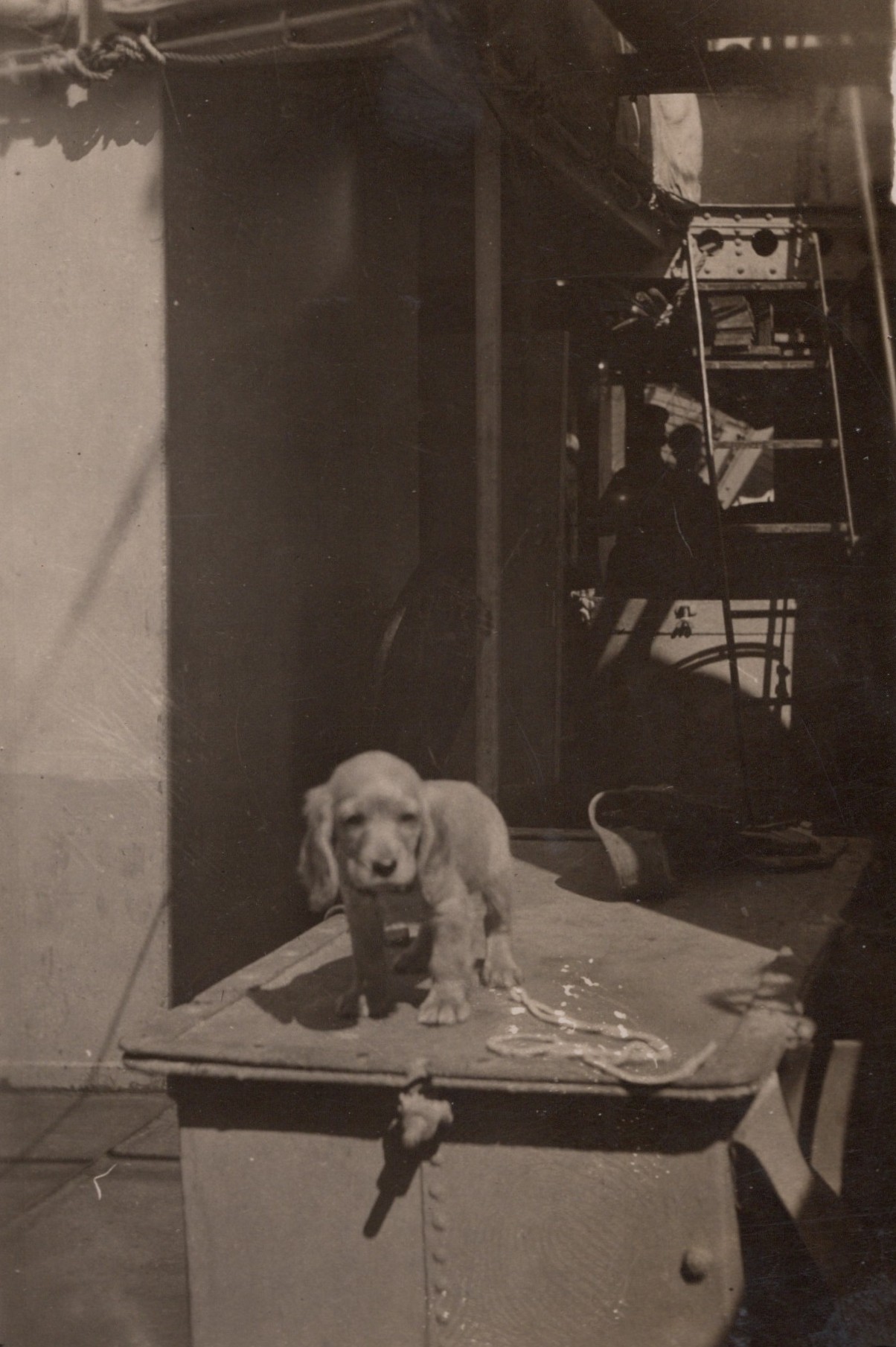 (JNC067) James Cox with shipmate by an anti-aircraft gun on HMCS HAMILTON I24 (JNC068) HMCS HAMILTON'S mascot (JNC069 - JNC071) James Cox onboard HMCS HAMILTON I24