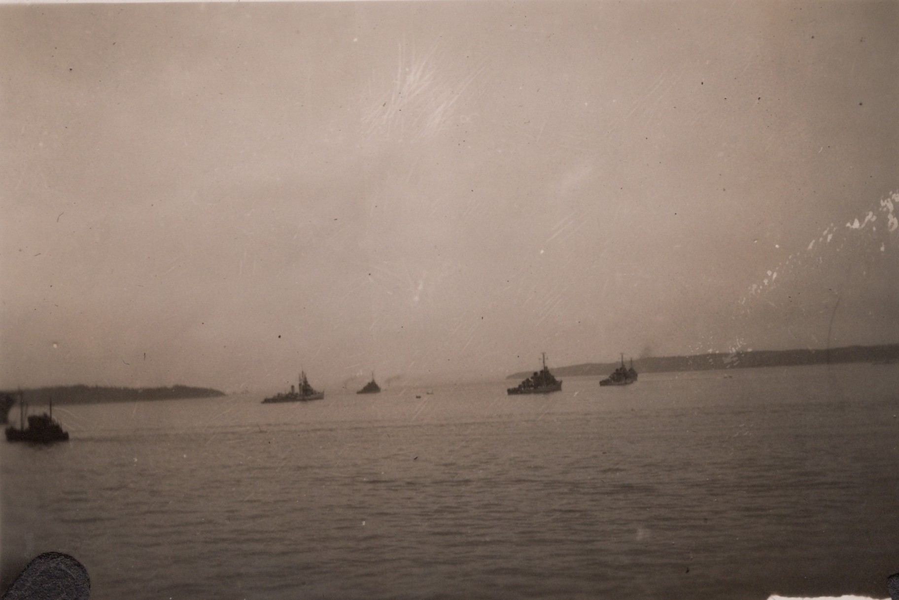 JNC053 (JNC053) Unknown American aircraft carrier with her destroyer escorts. Photo believed to have been taken in Halifax Harbour.