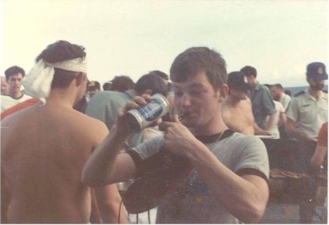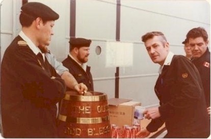 Tot time HMCS Iroquois 1979 - Then Commodore Edwards bought himself the rum barrel and wanted to commission it properly. What better way to do it than at sea, on a Sunday, off Trafalgar. UP SPIRITS ME LADS. Most famous comment of the day was by one OS who looked at me with glassy eyes and asked "Chief, is it true you guys did this every day?". Even the Commodore laughed.