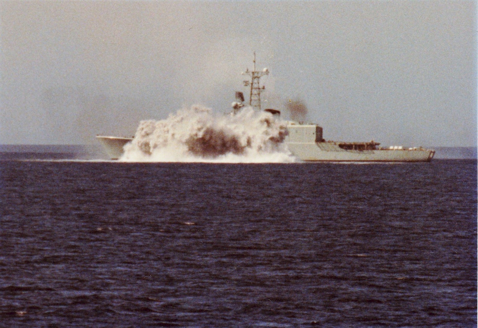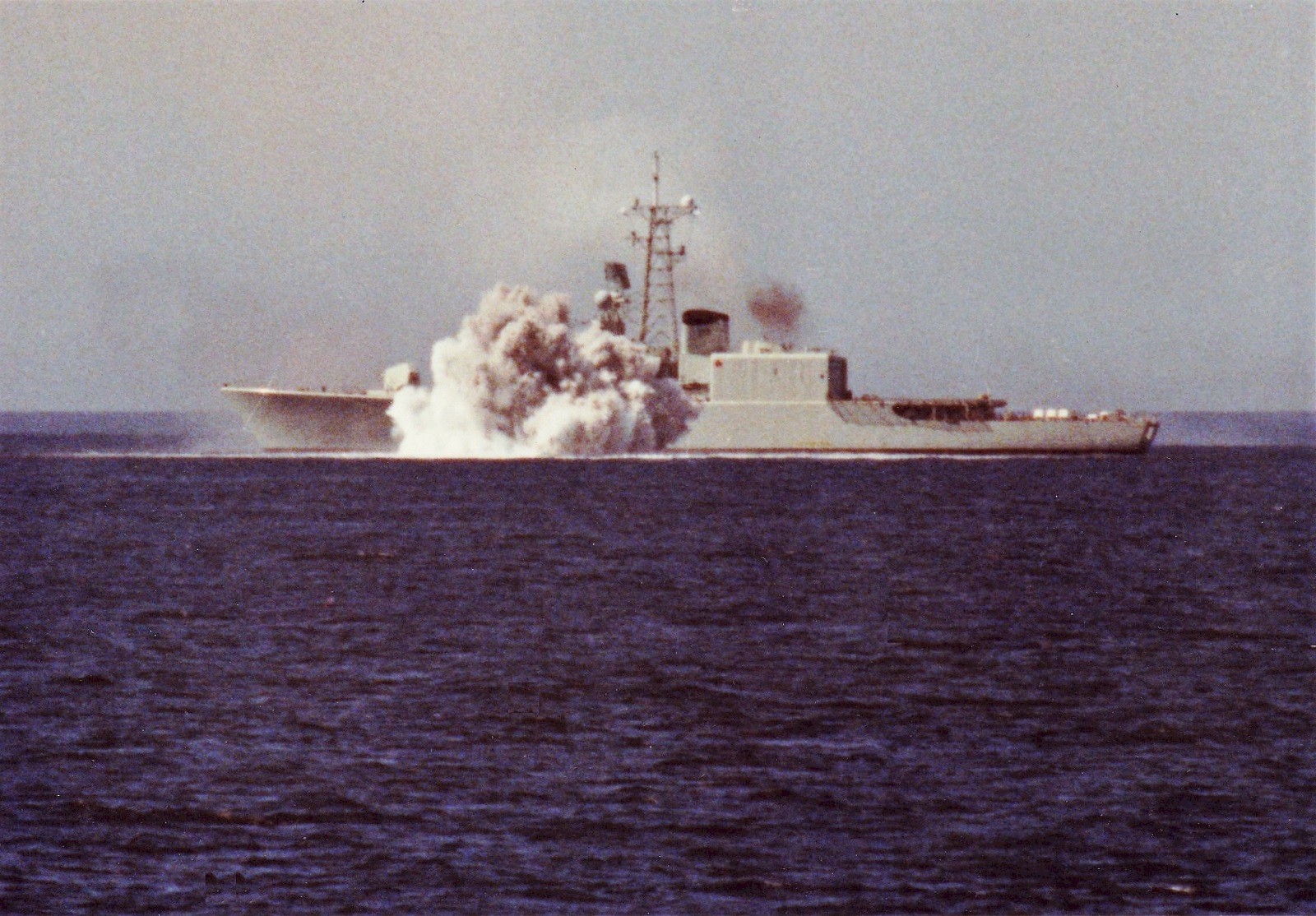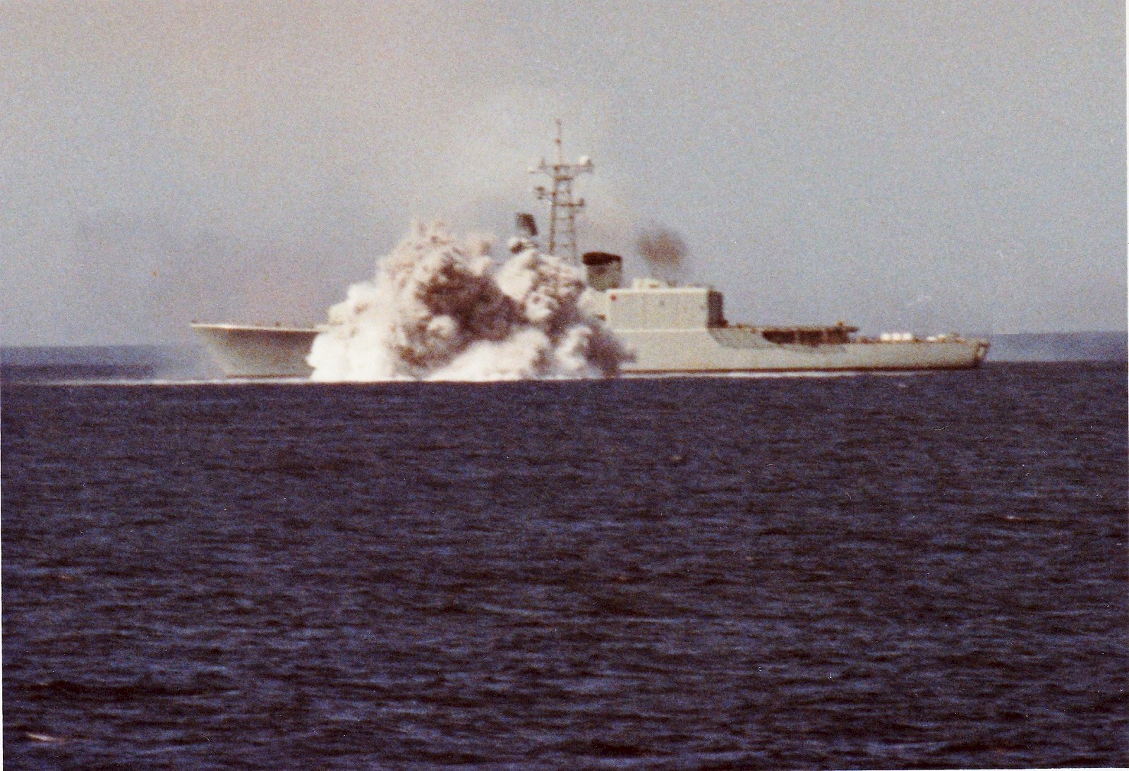 HMCS IROQUOIS 280 - Shock Trials - Sep 1980 Fifteen photos taken during HMCS IROQUOIS' shock trials. Photos were taken at 1/2 second intervals. © / Courtesy of Michael Sleigh - 1980 Click here to view the photo of the Shock Trials Crew - taken O/C of the shock trials