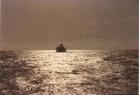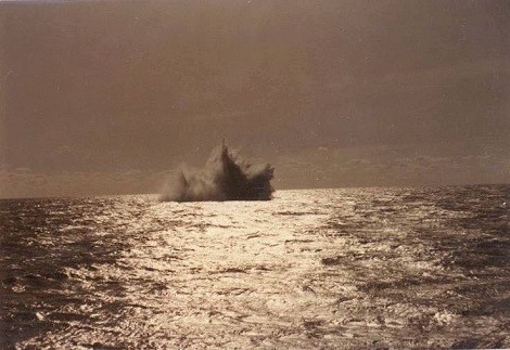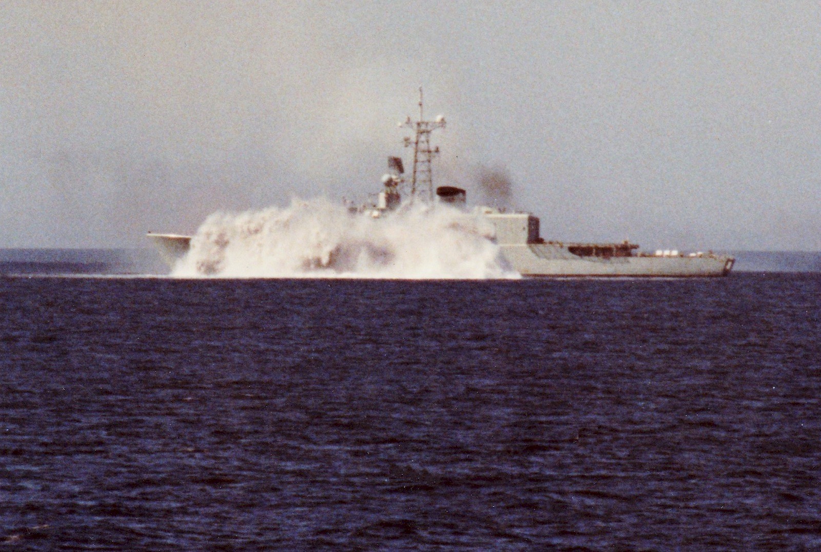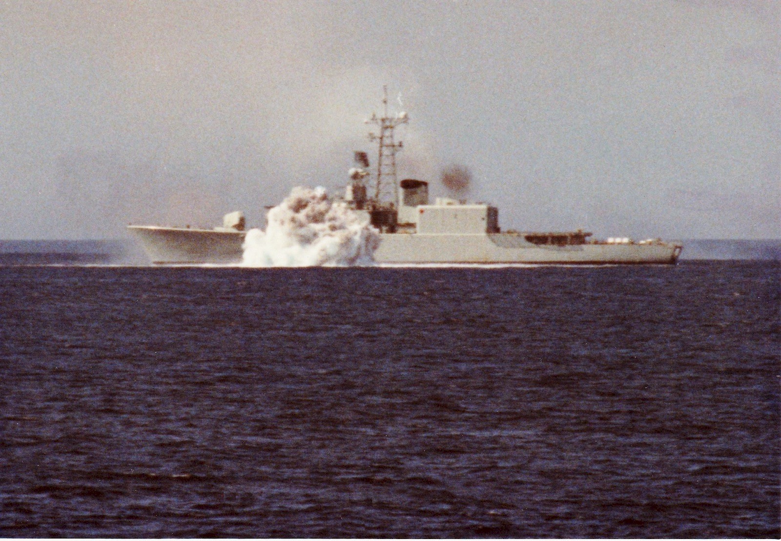 HMCS IROQUOIS 280 - Shock Trials - Sep 1980 Fifteen photos taken during HMCS IROQUOIS' shock trials. Photos were taken at 1/2 second intervals. © / Courtesy of Michael Sleigh - 1980 Click here to view the photo of the Shock Trials Crew - taken O/C of the shock trials