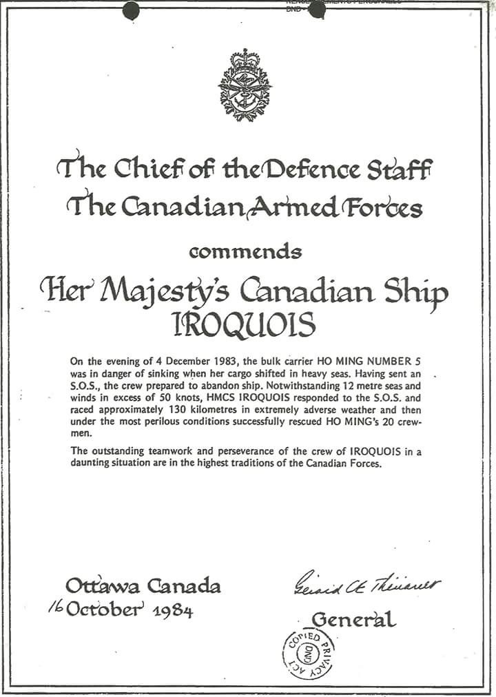 (IRO050) Write-up on the rescue of the crew of the Ho Ming 5 by HMCS IROQUOIS 280 on 05 Dec 1983. Four of HMCS IROQUOIS' Crew awarded the Star of Courage (IRO051) Chief of Defence Staff Commendation to the crew of HMCS IROQUOIS for the Ho Ming 5 rescue // Courtesy of George Damczyk (IRO052) Admiral Wood presenting PO2 Willy Wilson with a certificate relating to the Ho Ming 5 Rescue in Dec 1983 // Courtesy of Brian Lapierre