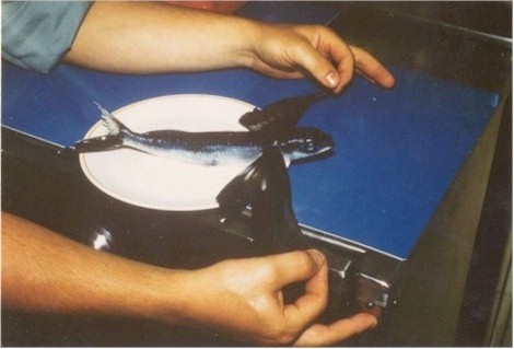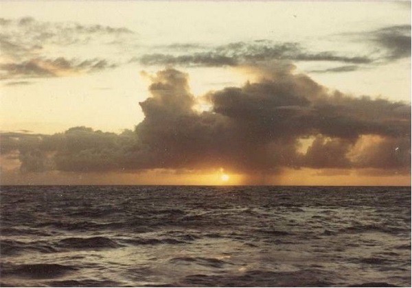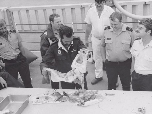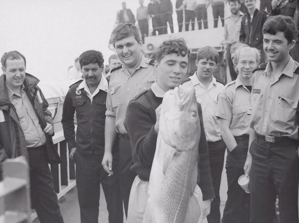 (IRO054 - IRO057) HMCS IROQUOIS crew members jigging cod at Virgin Rocks, Grand Banks, 1986 on the way home from a four month Standing Naval Force Atlantic deployment // Courtesy of John Newton, Rear-Admiral, RCN