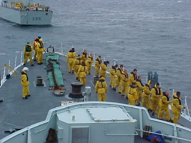 On 21 Mar 2000, IROQUOIS, as a member of a Canadian Task Group, left Halifax and headed south for spring exercises. While enroute south, news arrived that the bulk carrier Leader L. had gone down some 700 kilometres northeast of Bermuda. The task group was re-directed to offer assistance. When all was said and done, 13 survivors were picked up along with six bodies, 12 sailors were missing. IROQUOIS landed the survivors and bodies in Bermuda before rejoining the task group. Click here to read a write-up by Rear-Admiral John Newton on the Leader L. rescue