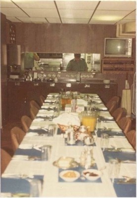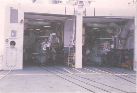 (MC010) Flying fish dinner on HMCS IROQUOIS 280 circa 1982-84 (MC011) Hangar on HMCS IROQUOIS 280 with two Sea Kings on board circa 1982-84 (MC012) Preparing for TOWEX on HMCS IROQUOIS 280 circa 1982-84 (MC013) Wardroom of HMCS IROQUOIS 280 set for breakfast circa 1982-84 (MC014) Storm in the Bermuda Triangle