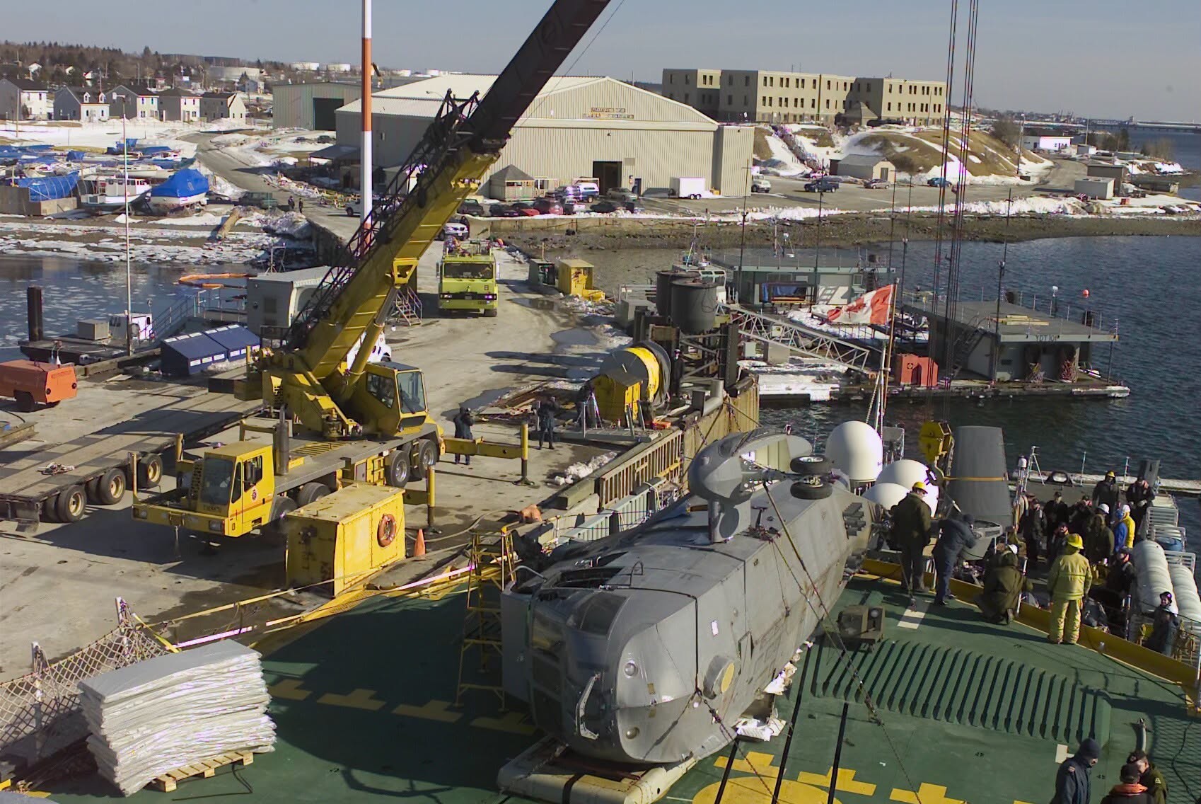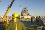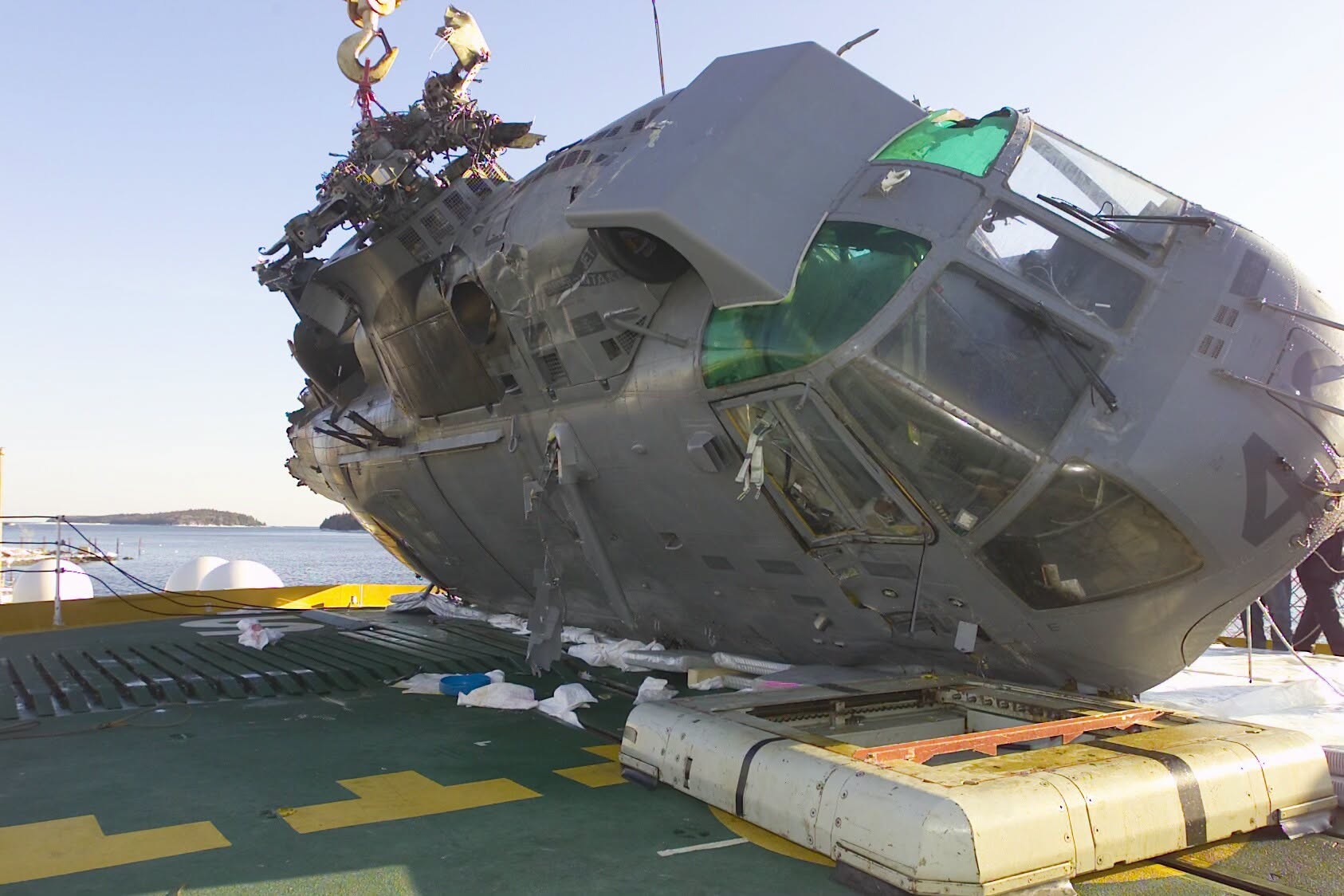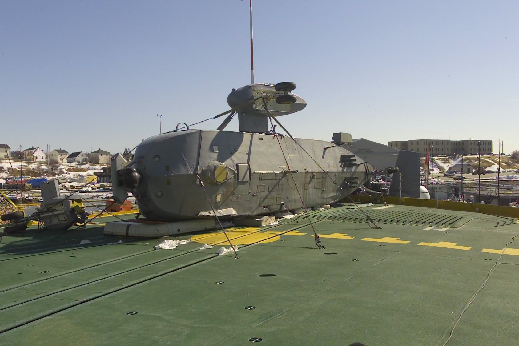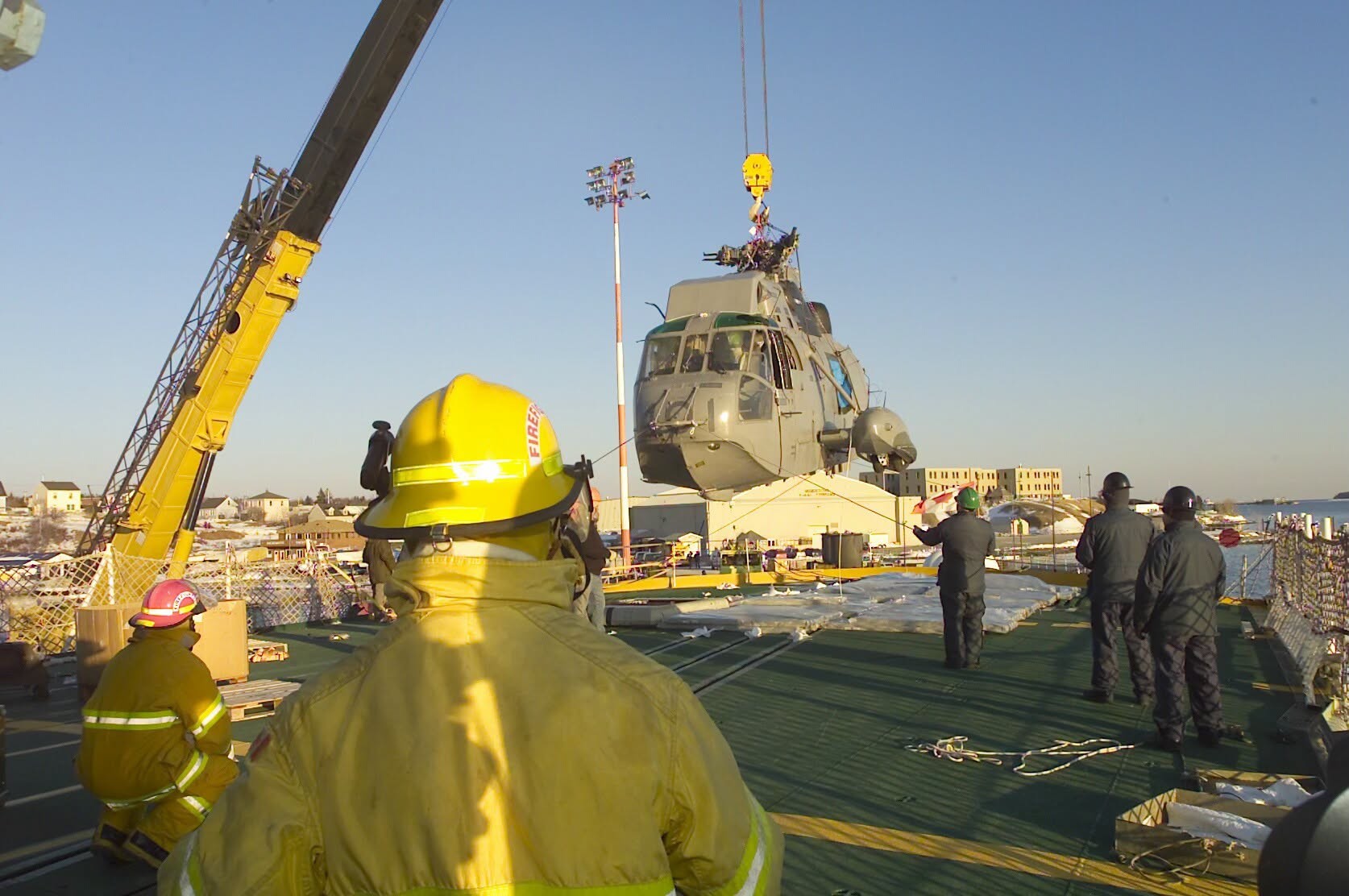 (IRO065 - IRO072) On 27 Feb 2003, after departing Halifax for a second Gulf War deployment, IROQUOIS's helo suffered a mechanical failure and crashed on deck. IROQUOIS returned to Halifax and the helo was craned off. With a new bird onboard, she resumed her deployment.