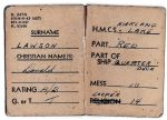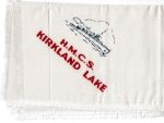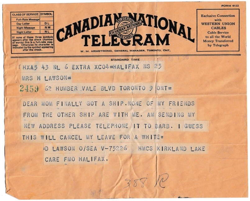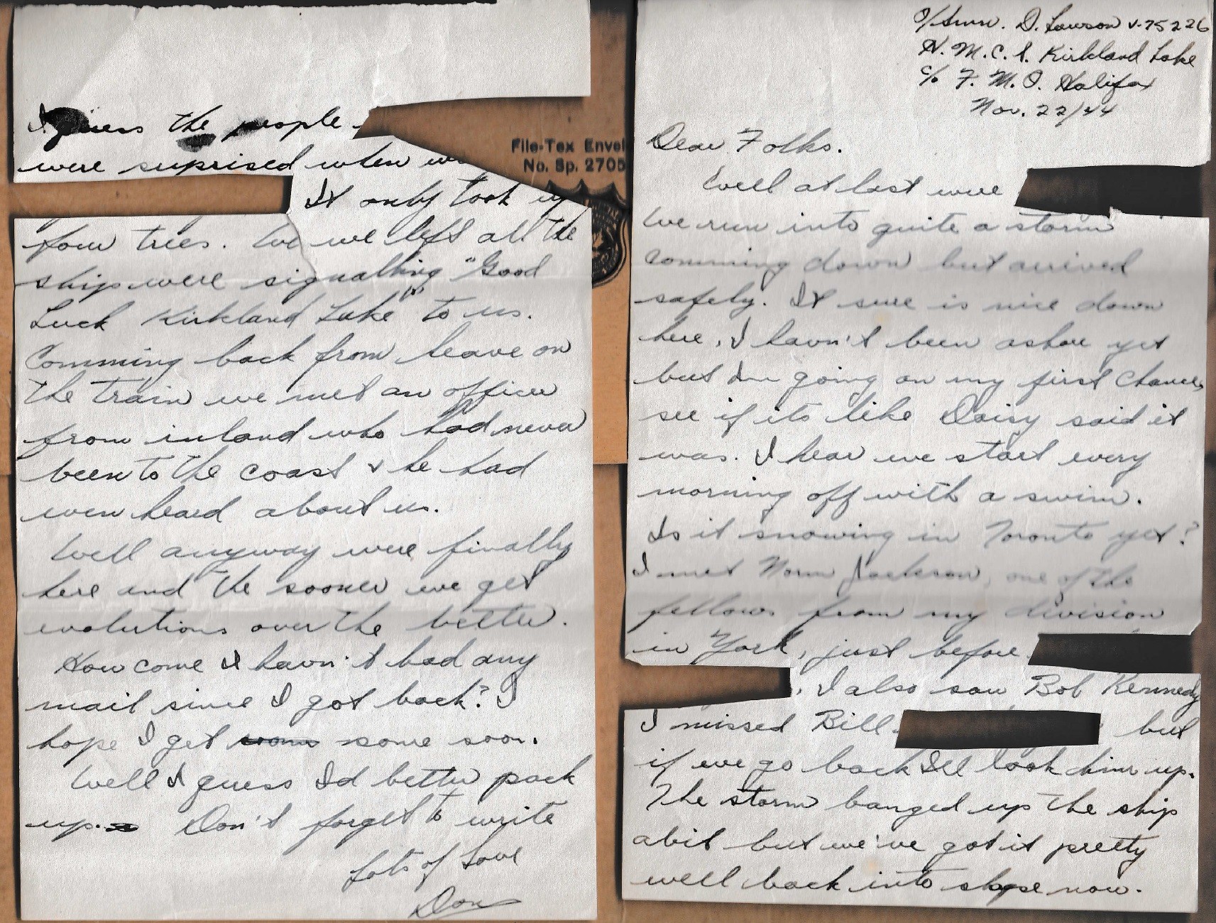 (DHL010) Leave Ticket for AB D. Lawson, HMCS KIRKLAND LAKE (DHL011) Telegram from OS Donald Lawson to his parents telling them he has been drafted to HMCS KIRKLAND LAKE (DHL012) Letter from OS Donald Lawson to his parents dated 22 Nov 1944. Note the parts of the letter removed by the censor (DHL013) OS D. Lawson's station card for HMCS KIRKLAND LAKE (DHL014) HMCS KIRKLAND LAKE scarf From the collection of Donald Lawson, Seaman Torpedoman, RCNVR Courtesy of Doug Lawson