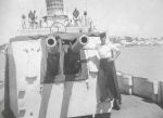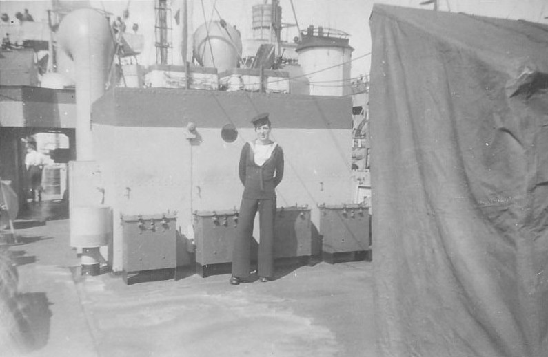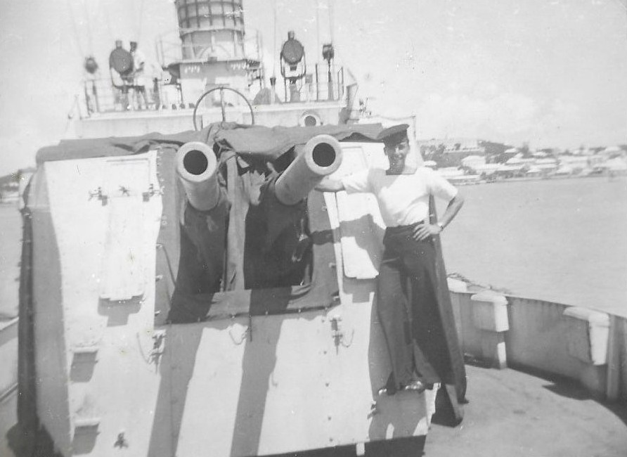 (WHV078) Unknown sailor by the twin 4-inch gun mount on HMCS LA HULLOISE K668 with Bermuda in the background. (WHV079-WHV082) Unknown sailor posing in various positions on HMCS LA HULLOISE K668. This is the same sailor in photo WHV079 (WHV082) Photo taken at St. John's, Newfoundland