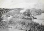 (JPB001) Front of HMCS LA HULLOISE Christmas Card // Webmaster's note: This photo is actually a photo of HMCS STETTLER with the pendant number on the ship's side removed and the details on the signal flags obscured. This was common when printing Christmas Cards for the ships during the war as having a stock photo of the class was more efficient than getting individual photos for each ship as most people would not notice any difference. Photo JPB002 is a copy of the original photo showing STETTLER'S pendant number (K681) on the hull and by signal flags. (JPB003) HMCS LA HULLOISE K668 conducting engine trials on the Kennebecasis River off Rothesay, NB 04 Oct 1945. LCdr John Brock, DSO, C.O. (JPB004) HMCS LA HULLOISE passing going under the Reversing Falls’ road and railway bridges on her way to Indiantown, about 1 km upstream for work at a small yard off Bridge Street. Note the 3 tugboats assisting in LA HULLOISE'S short trip. The Reversing Falls can only be traversed at slack tide between low and high tide and there is only about a 20 minute window, 4 times daily. From the collection of LCdr John Brock Courtesy of Leonard Lee-White