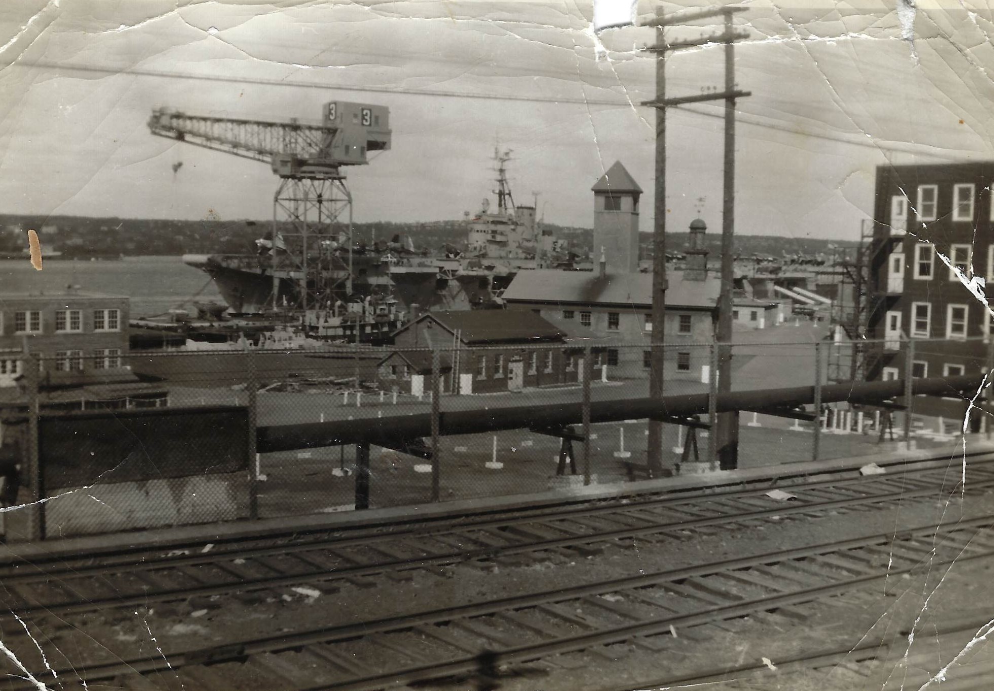 (TJW025) HMCS MAGNIFICENT below the MacDonald Bridge, Halifax between Apr 1955 - Jun 57 From the collection of Terry Whiteland, RCN Courtesy of Steve Whiteland
