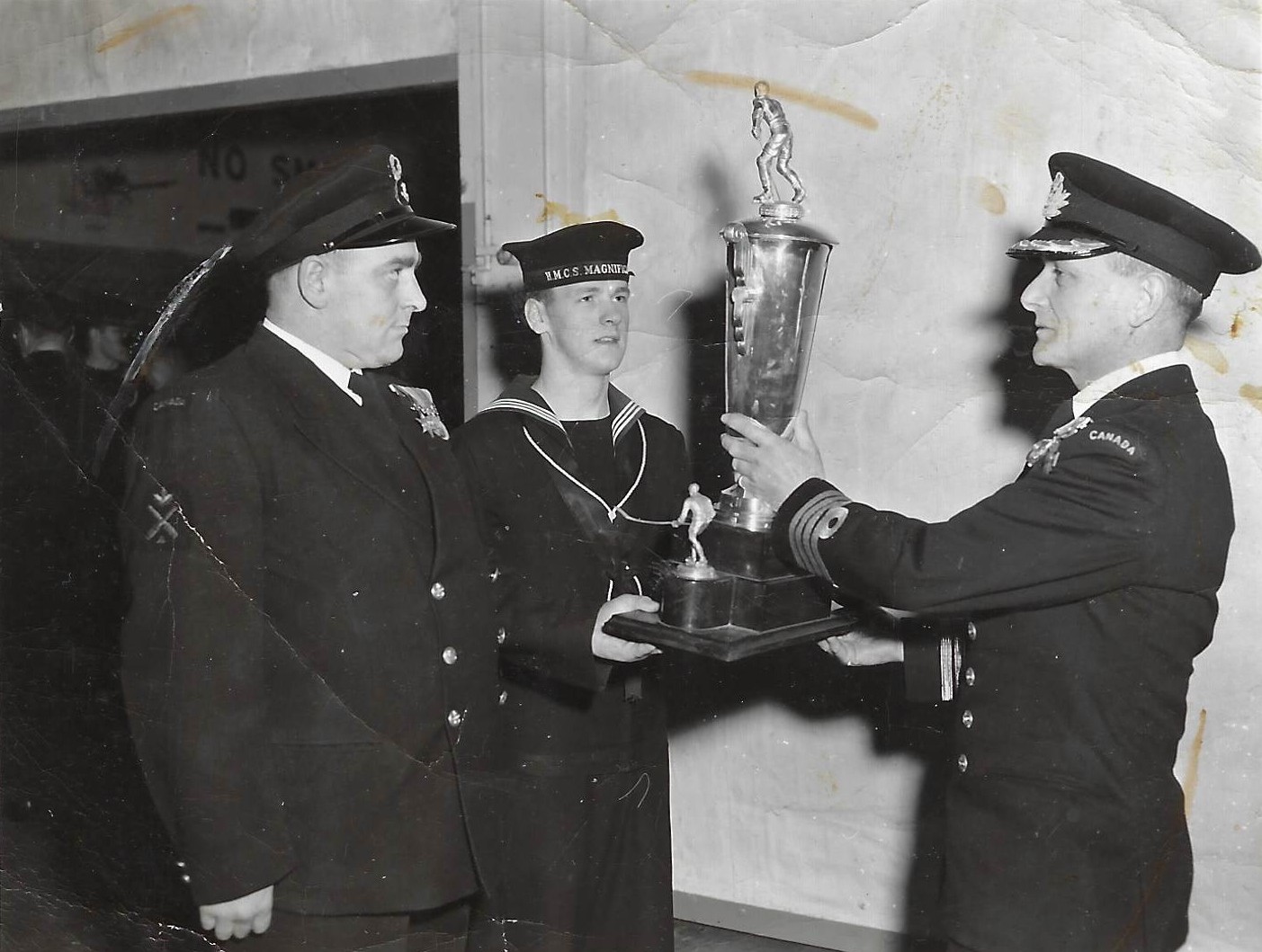 (MDP003) HMCS MAGNIFICENT at Halifax (MDP004) Fleet Hockey Trophy being awarded to a team member from HMCS MAGNIFICENT. PO1 Malcolm Payne on the left From the collection of Malcolm Douglas Payne, C2BN, RCN Courtesy of Ron Payne, Sgt, CD, ret'd