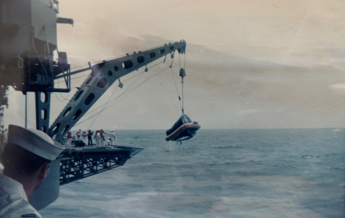 (TK005) Apollo capsule being craned onto the flight deck of USS Hornet with astronauts still sealed on board on 24 Jul 1969 From the collection of Tom Koritar, Leading Seaman Marine Engineer, RCN / C.A.F. (Navy)