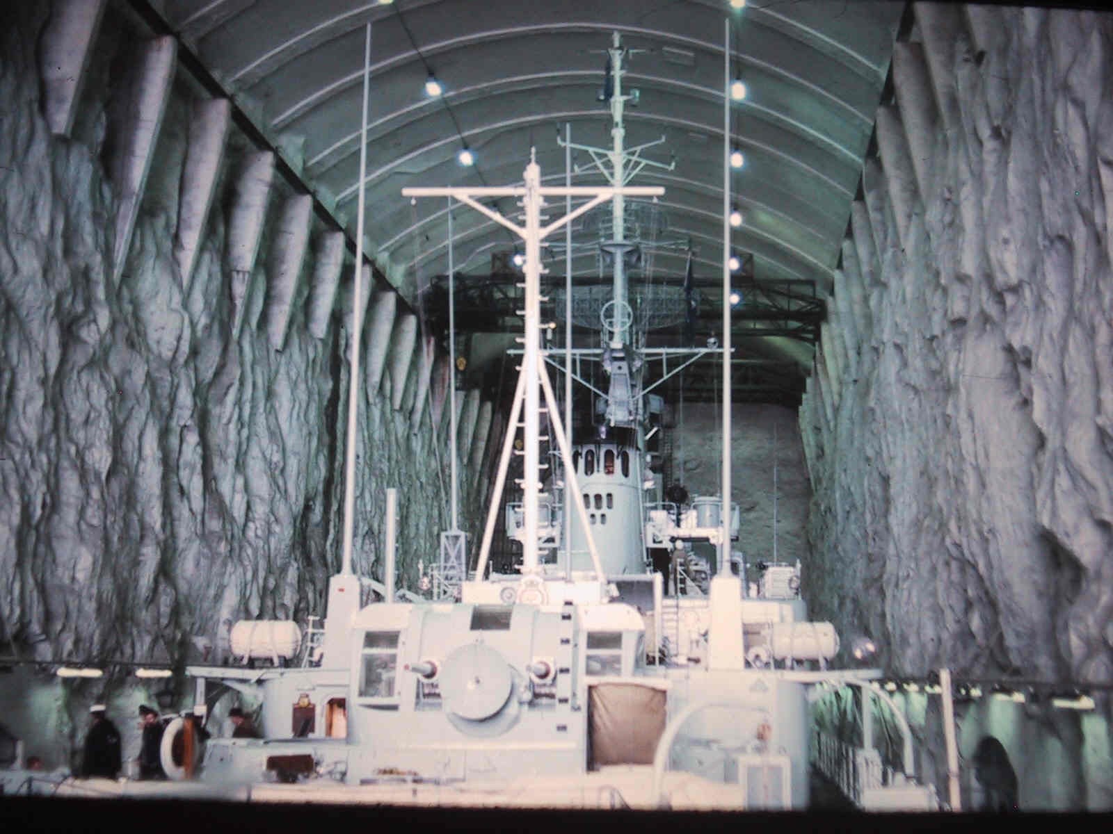 (TK001-TL003) HMCS RESTIGOUCHE enters a Norwegian drydock, built into a mountain, to paint ship (TK004) Jetty where Bismarck received stores that were stored / delivered from inside the mountain