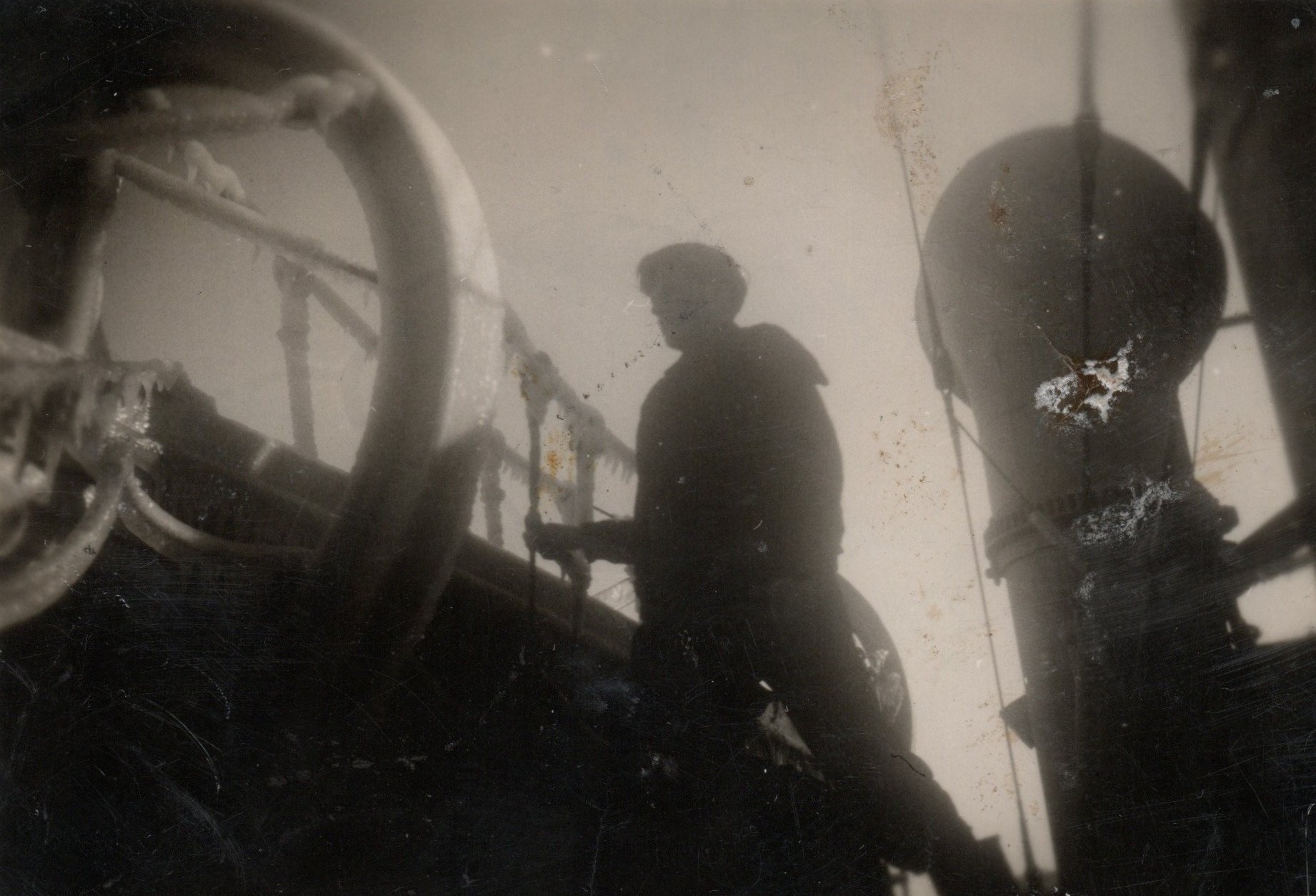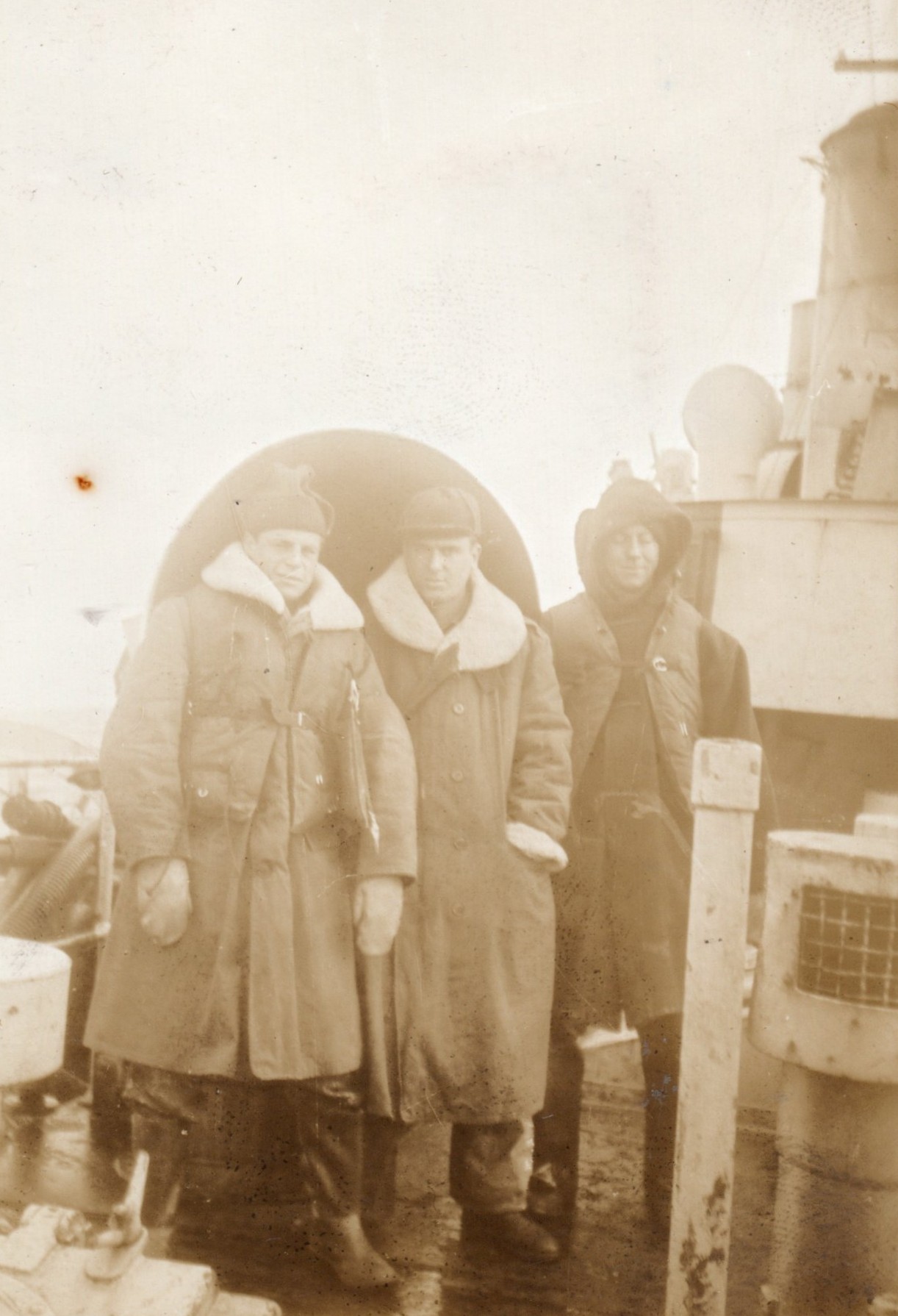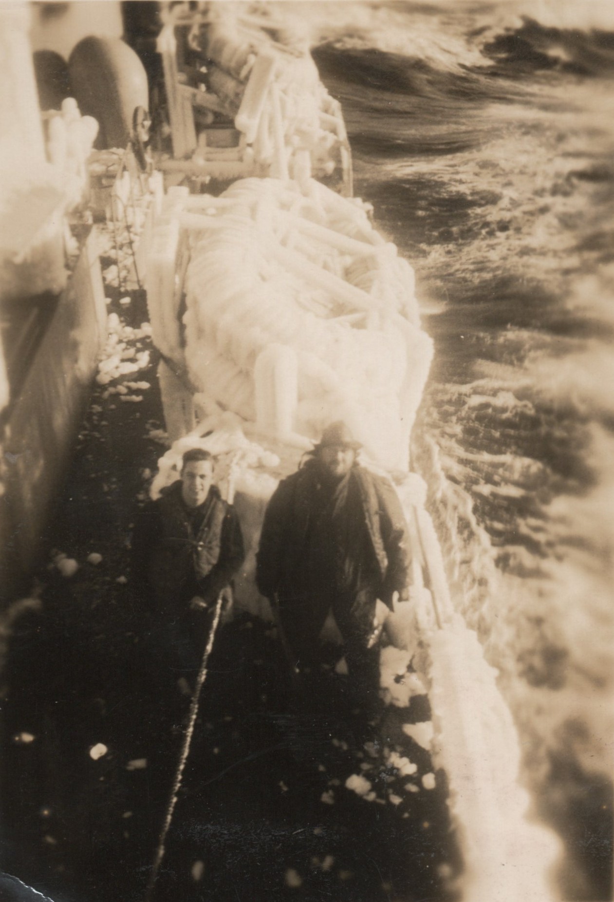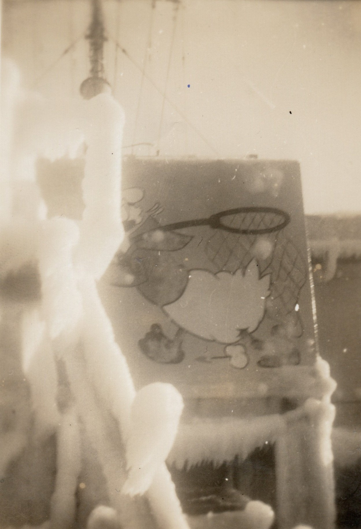 (CGWJ047 - CGWJ048) Sailors chipping ice on HMCS TRILLIUM K172 (CGWJ049) HMCS TRILLIUM K172 covered in ice. The ship's gunshield art was moved to the bridge face after refit. (CGWJ050) Walt Johnson (left) with two unknown shipmates on HMCS TRILLIUM K172 (CGWJ051) Unknown sailor standing watch as lookout in the after gun tub on HMCS TRILLIUM K172