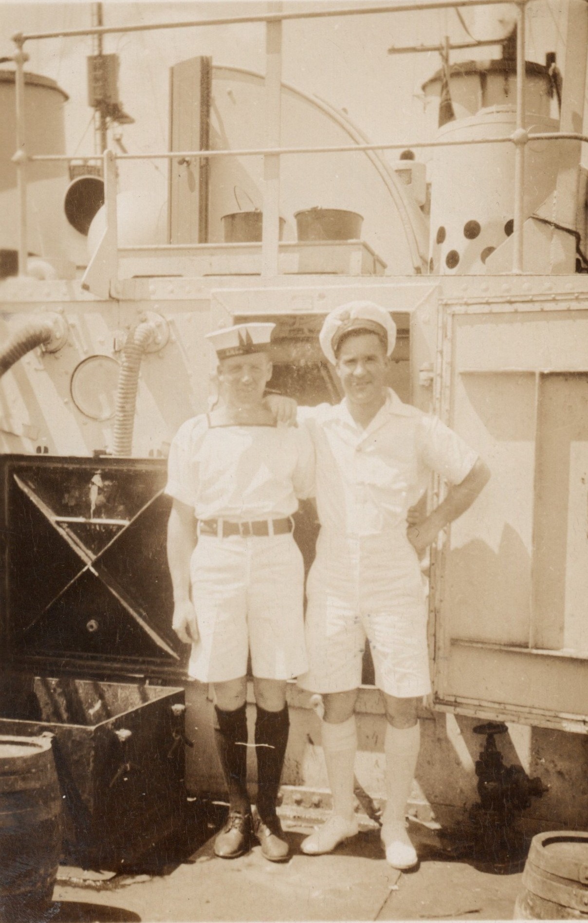 (TB15) "Spud" Gillan with Cook Blakenby on HMCS TRILLIUM K172 (TB16) Unknown sailor as on watch as Quartermaster on HMCS TRILLIUM K172 (TB17) "Spud" Gillan and Frank by the 4-inch gun on HMCS TRILLIUM K172 (TB18) F. Williams and Macmillan on HMCS TRILLIUM K172 (TB19) Ted Brown manning the twin .50 cal machine guns on HMCS TRILLIUM K172