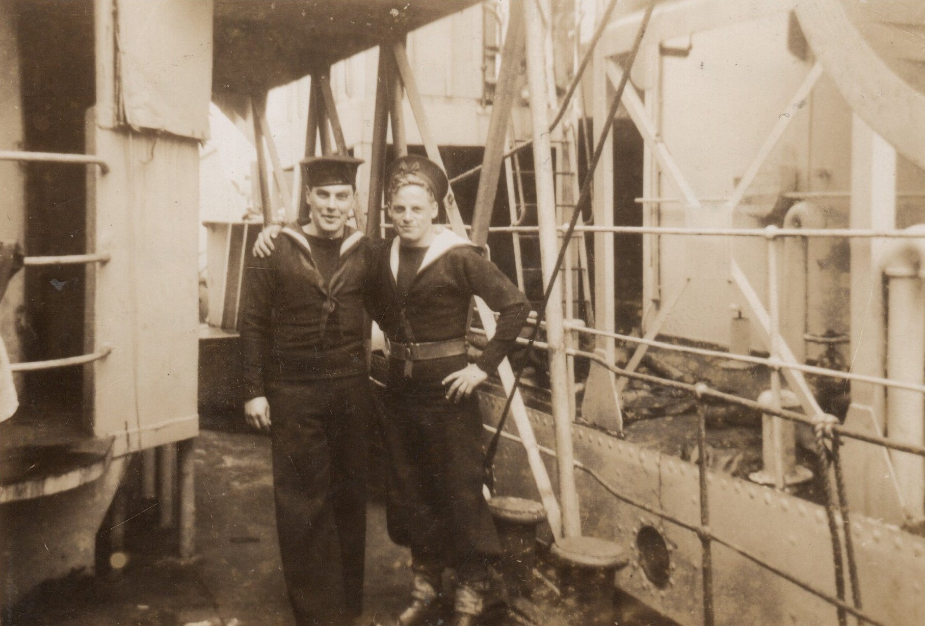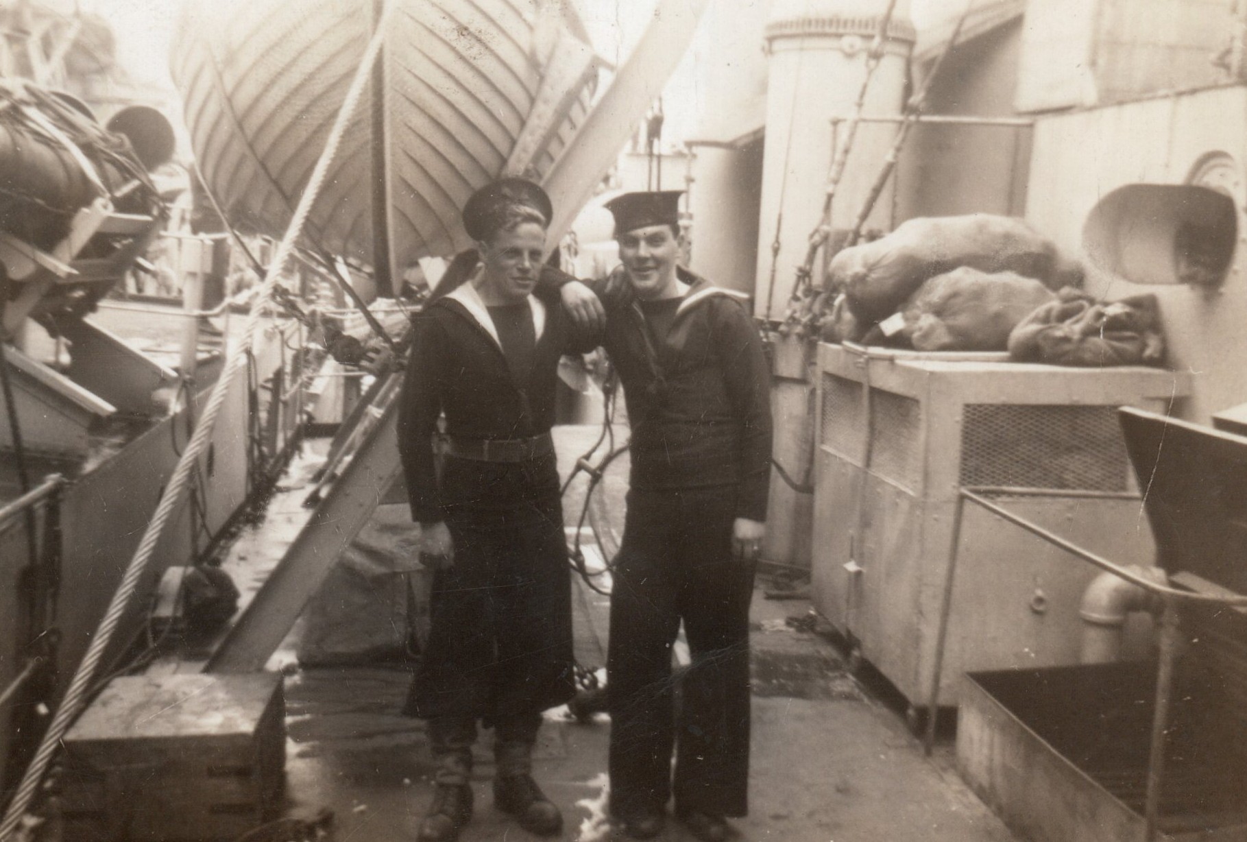 (CGWJ037) Walt Johnson on HMCS TRILLIUM K172 (CGWJ038) Les Lowe on HMCS TRILLIUM K172. The ship's gunshield art is now on the face of the bridge. (CGWJ039) Les Lowe (left) and Walt Johnson on HMCS TRILLIUM K172. Walt, with belt and gaitors, is dressed for duty at the brow. (CGWJ040) Walt Johnson (left) and Les Lowe on HMCS TRILLIUM K172. Walt, with belt and gaitors, is dressed for duty at the brow. (CGWJ041) Unknown sailor standing on the ship's side of HMCS TRILLIUM K172