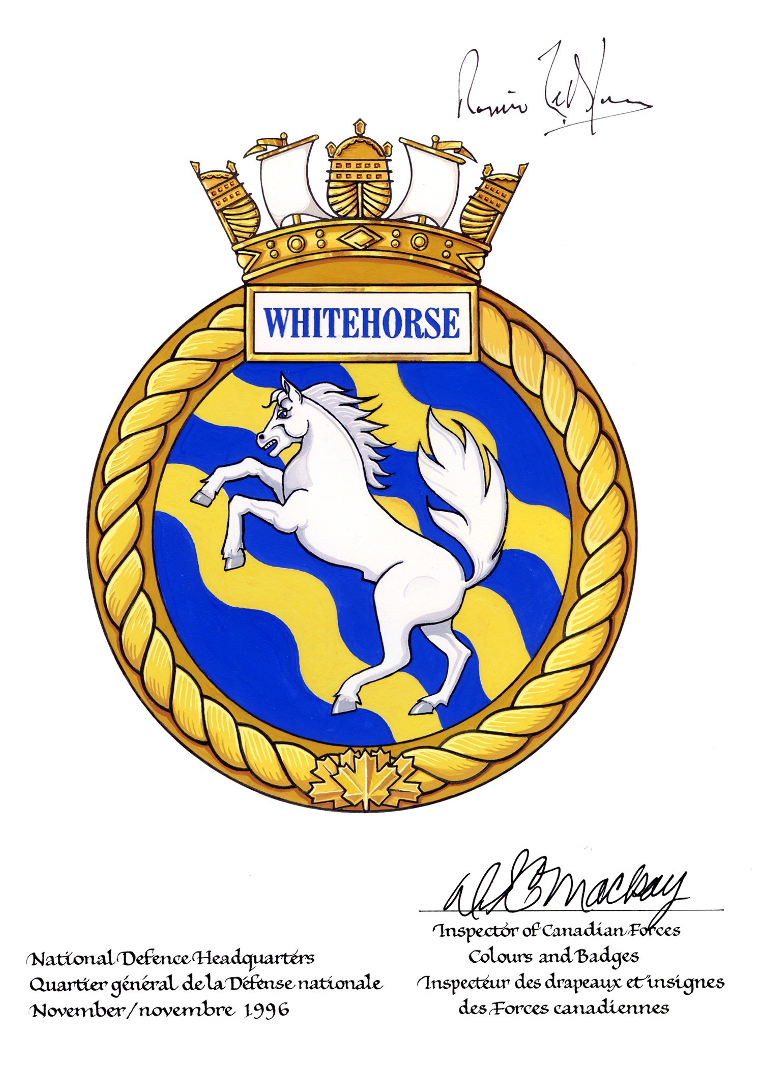 (WHT001) Official badge for HMCS WHITEHORSE 705 (WHT002) A Sea King Helicopter flies above HMCS WHITEHORSE 705 at the entrance of Esquimalt Harbour. RCN image # ETC00-0062-06 (WHT003) HMCS WHITEHORSE 705 departs Esquimalt ON 04 May 2000 for Rimpac 2000 // RCN image # ETC00-0123-09 (WHT004) HMCS WHITEHORSE 705 and HMCS BRANDON 710 at Y jetty, Esquimalt Harbour 15 Mar 2002 // RCN image # ETC02-0083-41 (WHT005) HMCS WHITEHORSE 705 at sea near Esquimalt, BC - 23 May 2003 // RCN image # HS030412d07
