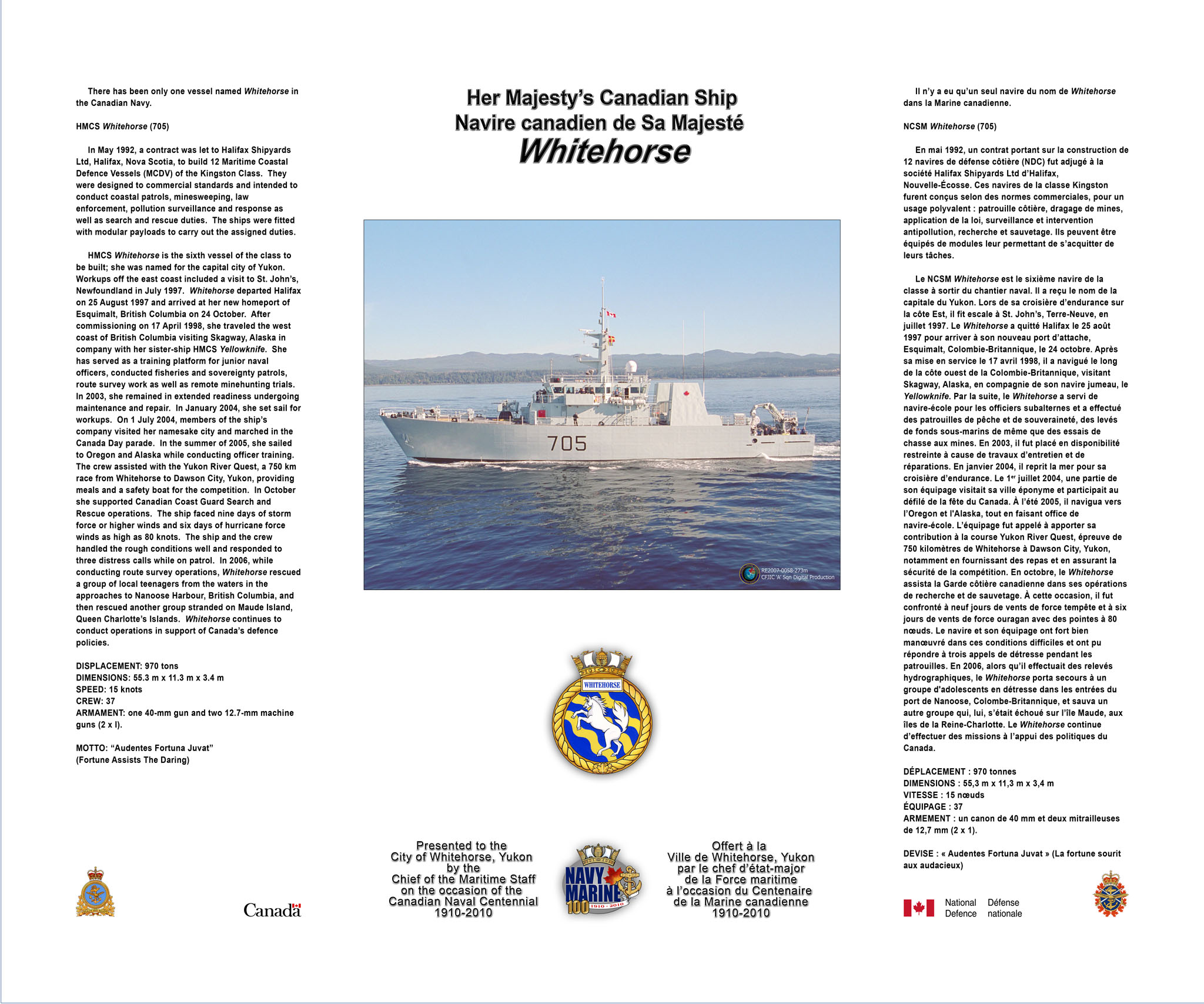 (WHT006) HMCS YELLOWKNIFE 14 Sep 2007 // RCN image # ETC99-139-4 (WHT007 - WHT008) Gunshield art on the 40mm Bofor on HMCS WHITEHORSE circa 2007 // The artwork was painted by MS.ET Chris Fraser and P1.BN Travis Gray (Buffer) // Courtesy of CPO2 Tim Cotey (WHT009) Contents of frame plaque presented to the city of Whitehorse, Yukon in 2010 on the 100th anniversary of the creation of the RCN. // RCN image # RE2007-0058-273m (WHT010) HMCS WHITEHORSE 705 passing USS RONALD REAGAN during the RCN's Centennial Celebrations at Victoria, British Columbia - 06 Jun 2010 // Photographer: Mr. Jonathan Evans // RCN image # PM2010-0044
