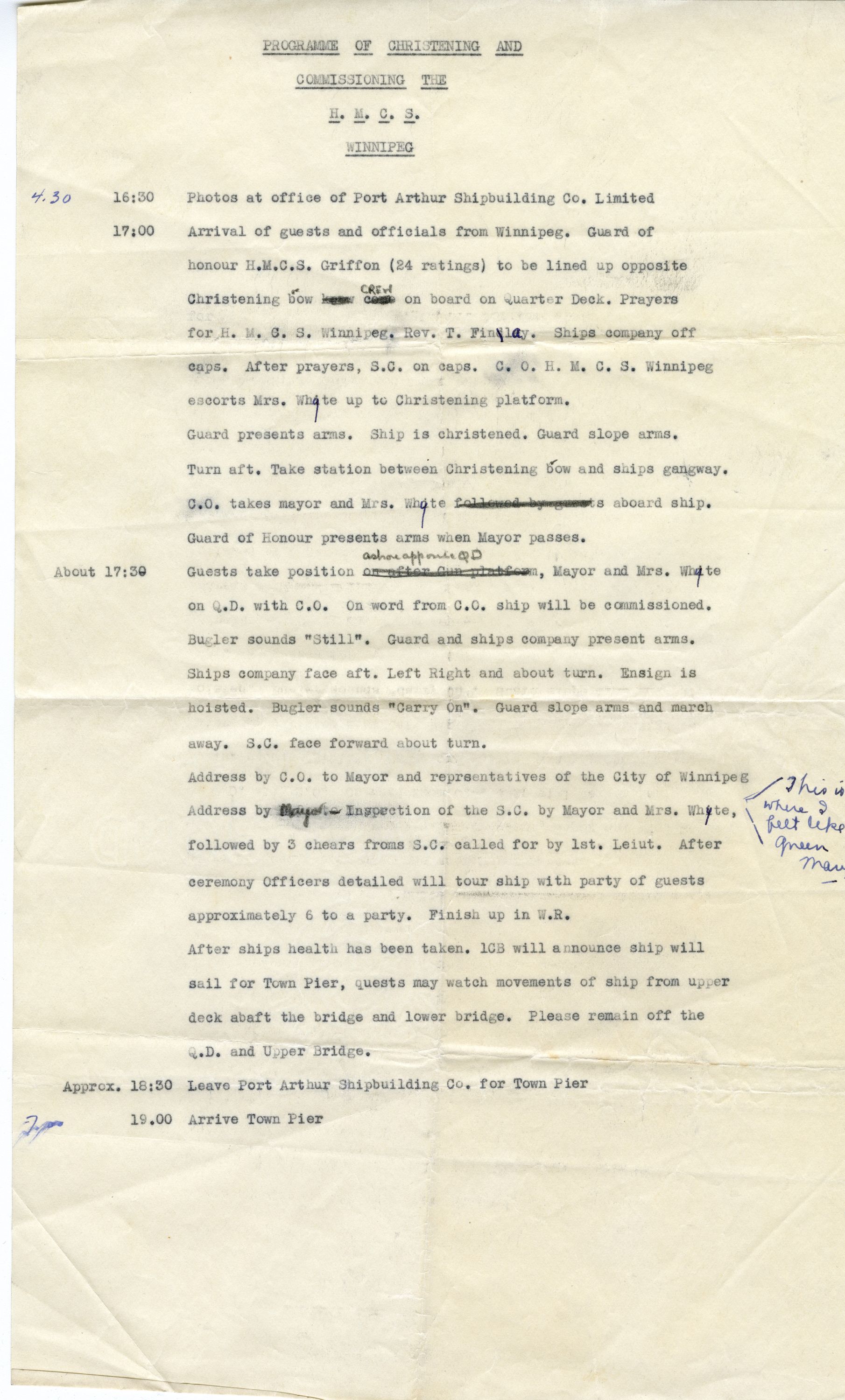 (WNI-NMoM003) Mrs. William Whyte, who will christen HMCS WINNIPEG, seen receiving completed depth charge sheets. Each sheet represents $90 worth of war savings stamps sold to purchase a depth charge. (WNI-NMoM004) Admiring Toots Greet Trim Fighting Ship - HMCS Winnipeg Is Maze of Wires and Gadgets, All Compactly Fitted (WNI-NMoM005) Through Trials - Final Preparations Made For Today's Christening Ceremony (WNI-NMoM006) Winnipeg citizens depart Winnipeg by CPR to attend the christening of HMCS WINNIPEG (WNI-NMoM007) Mayor Garnet Coulter addresses the officers and men of HMCS WINNIPEG at her christening ceremony