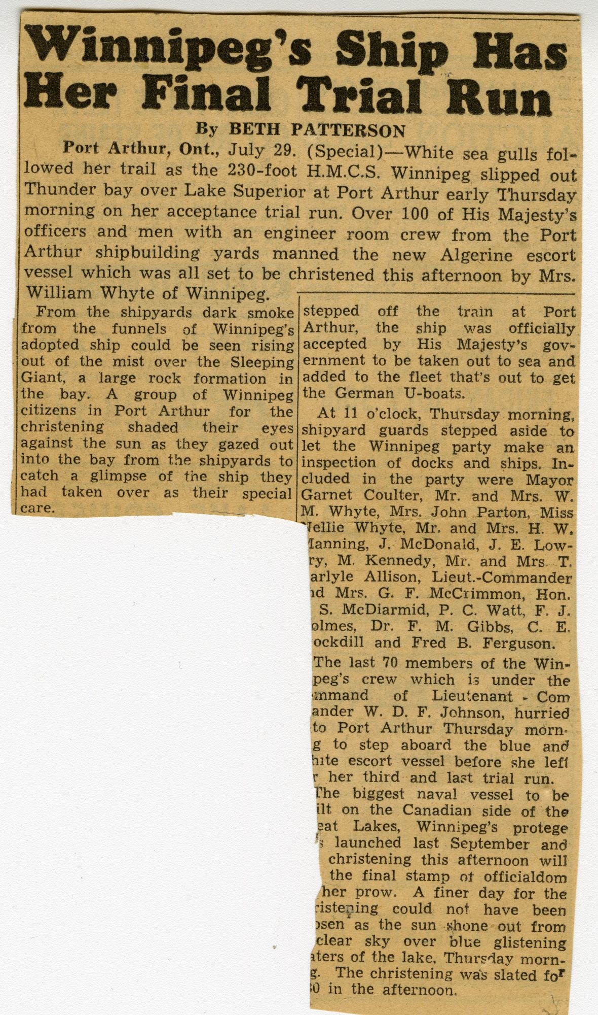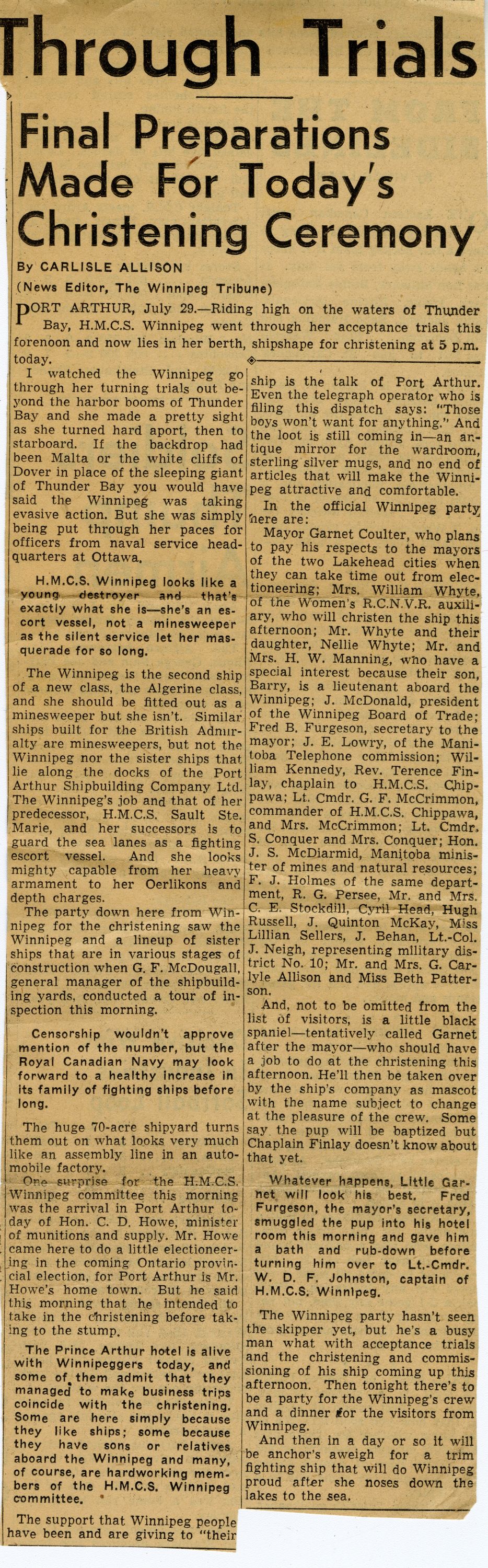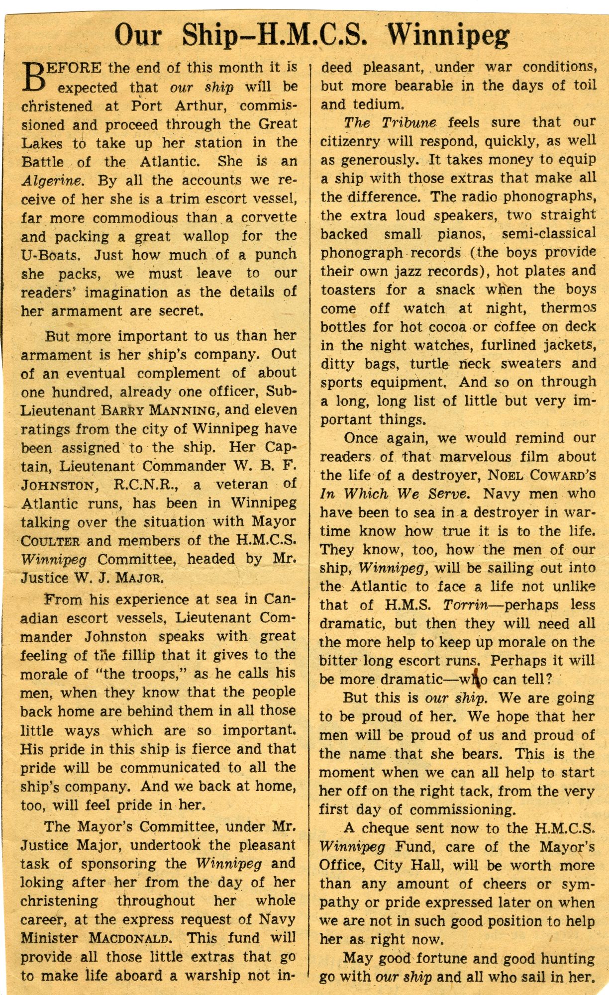 (WNI-NMoM018) Unfortunately Mr. Mayor Lacked A Wife (WNI-NMoM019) Mayor Launches Fund For Adopted Minesweeper (WNI-NMoM020) Minesweeper Fund At $607 (WNI-NMoM021) LCdr W. D. F. Johnston on special assignment - no longer in command of HMCS WINNIPEG (WNI-NMoM022) Ride on "WINNIPEG" Thrills Visitors