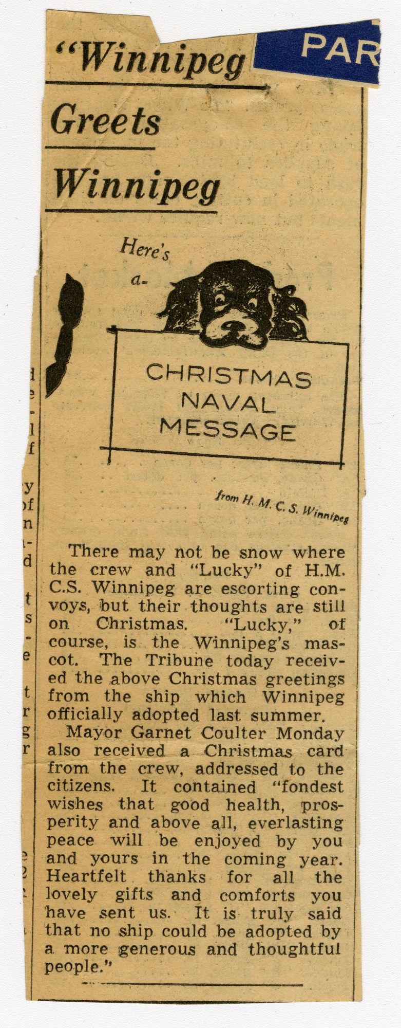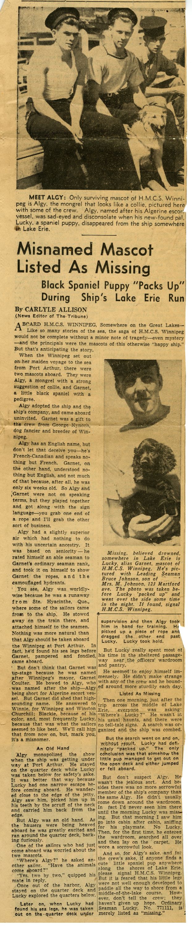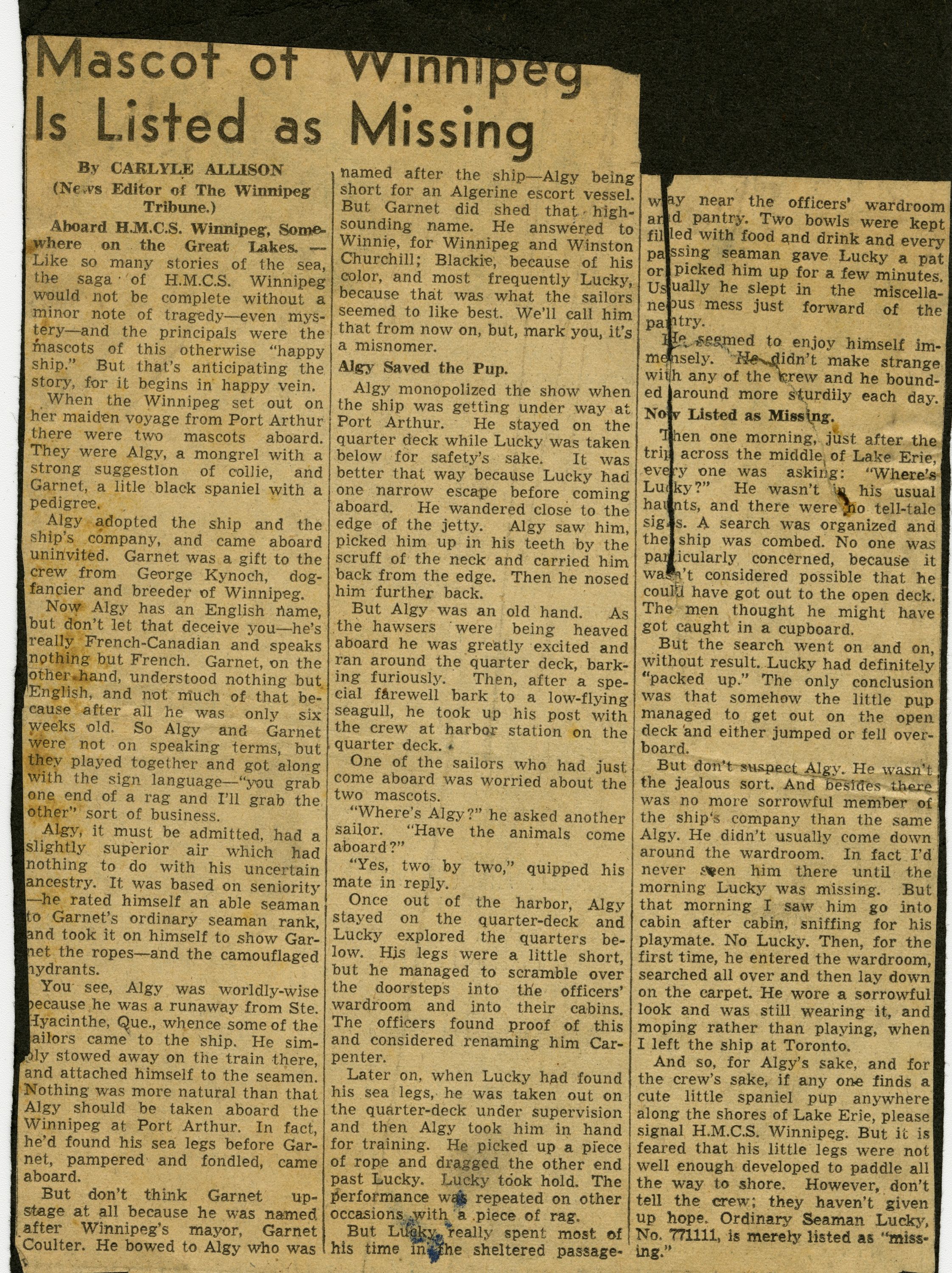 (WNI-NMoM008) HMCS WINNIPEG'S mascot Lucky missing believed drowned in Lake Erie (WNI-NMoM009) Algy, ship's mascot of HMCS WINNIPEG bemoans the loss of his companion mascot, Lucky, lost on Lake Erie (WNI-NMoM010) Fate of Ship Mascot Revealed in a letter (WNI-NMoM011) Luckier, half-brother of Lucky, becomes new ship's mascot for HMCS WINNIPEG (WNI-NMoM012) Mascot of Winnipeg Is Listed as Missing