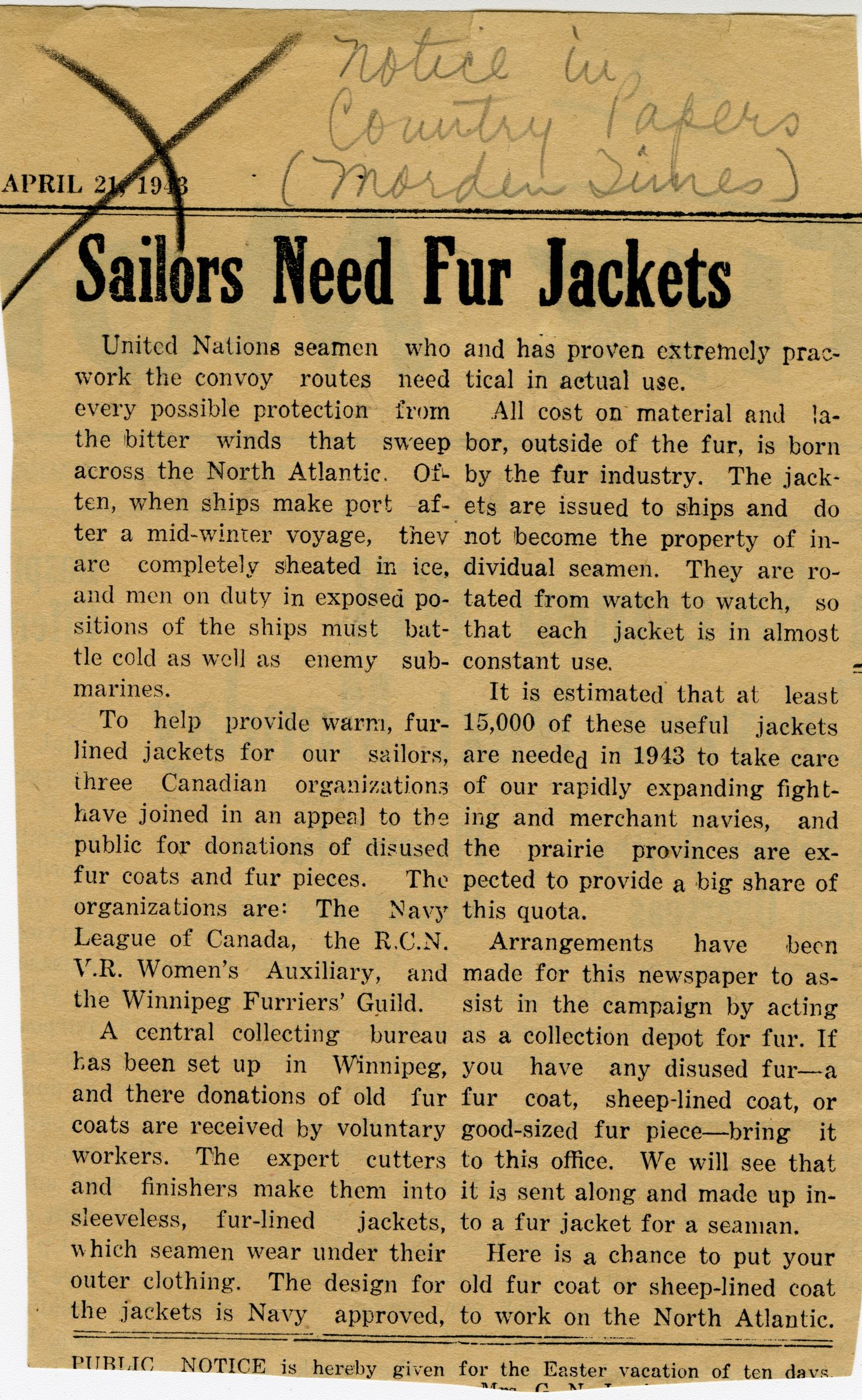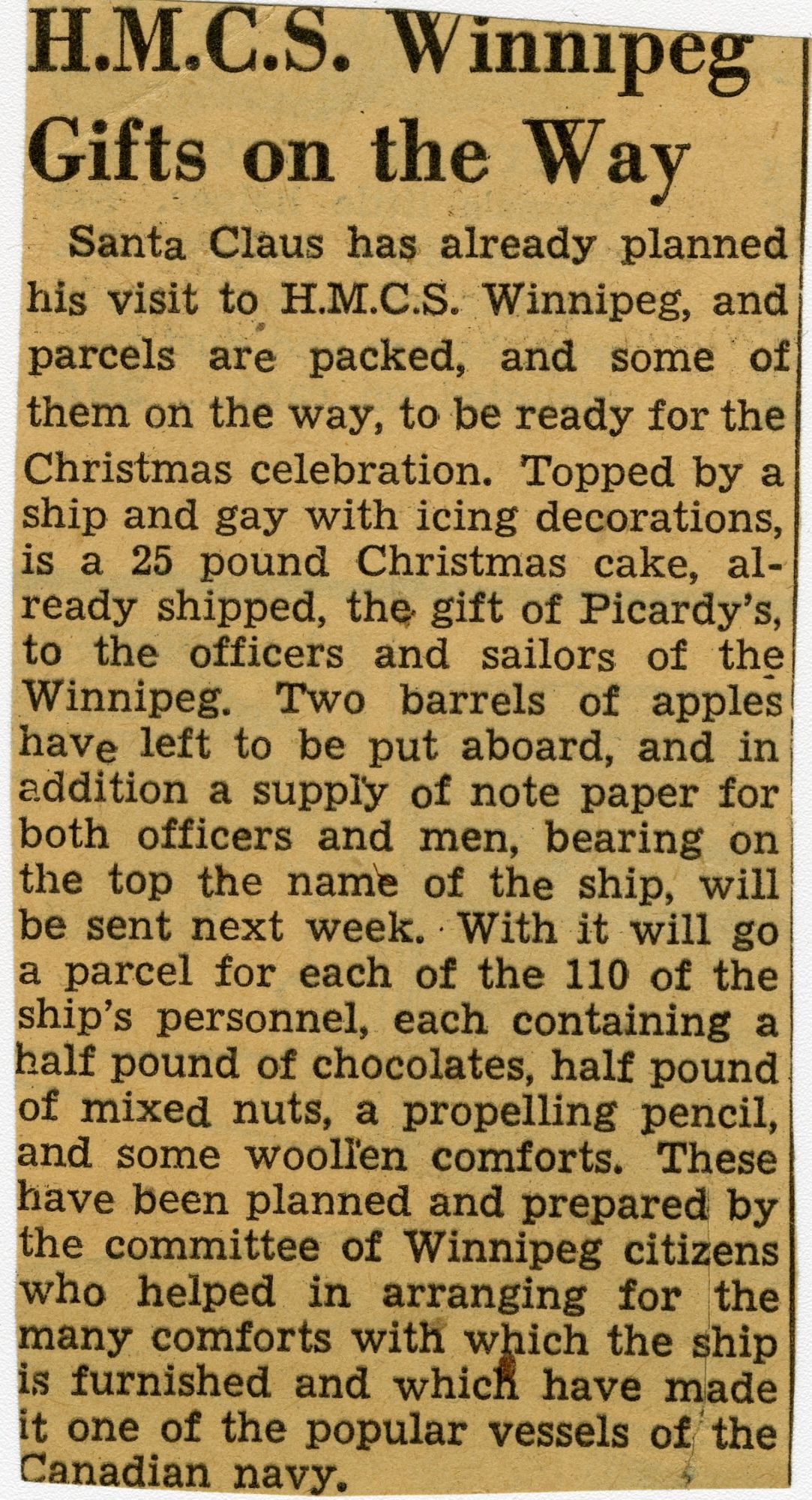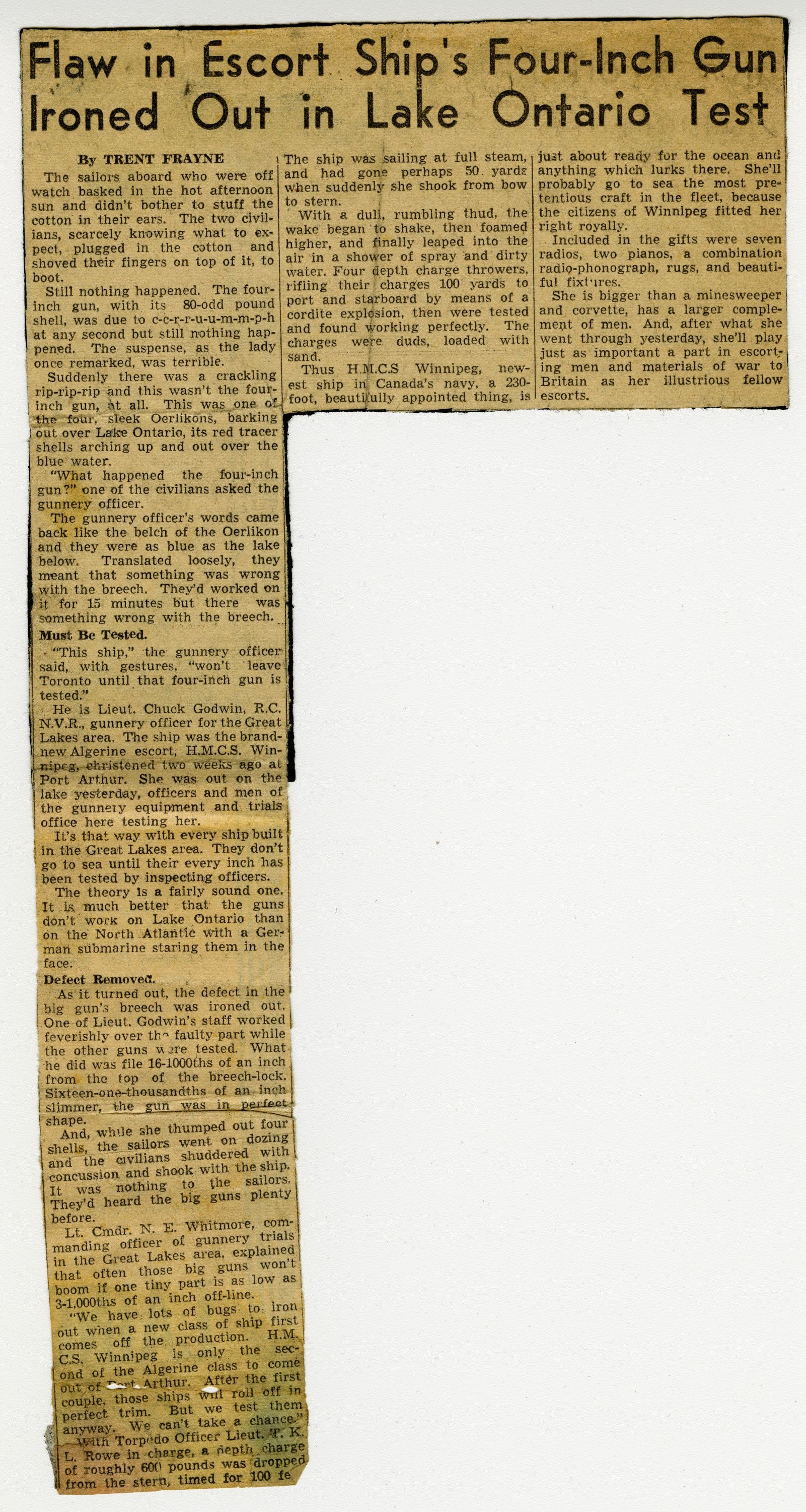 (WNI-NMoM028) Mayor Coulter of Winnipeg inspects ship's company (WNI-NMoM029) Sailors Need Fur Jackets, 21 Apr 1943, The Morden Times (WNI-NMoM030) Flaw in Escort Ship's Four-inch Gun Ironed Out in Lake Ontario Test (WNI-NMoM031) HMCS WINNIPEG conducts gun trials on Lake Ontario (WNI-NMoM032) Christmas Cake for WINNIPEG