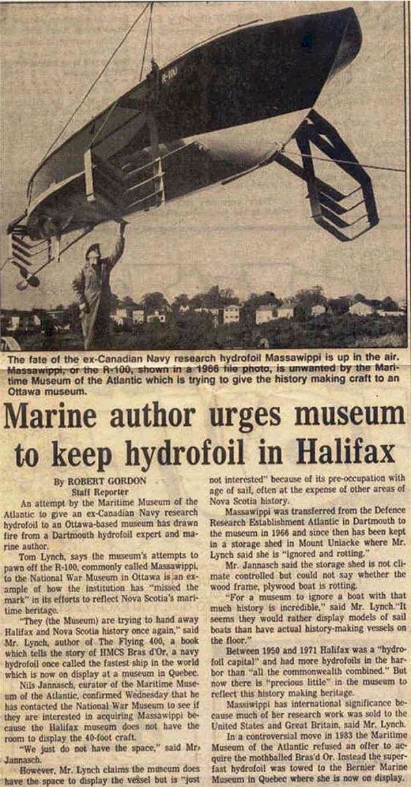 Massawippi was a 45-foot hydrofoil craft also known as R-100 or KC-B, during 1953 trials. This was the first of four experimental hydrofoils that Canada's DREA (Defense Research Establishment Atlantic) operated between 1950 and 1979. (Source: International Hydrofoil Photo Gallery)