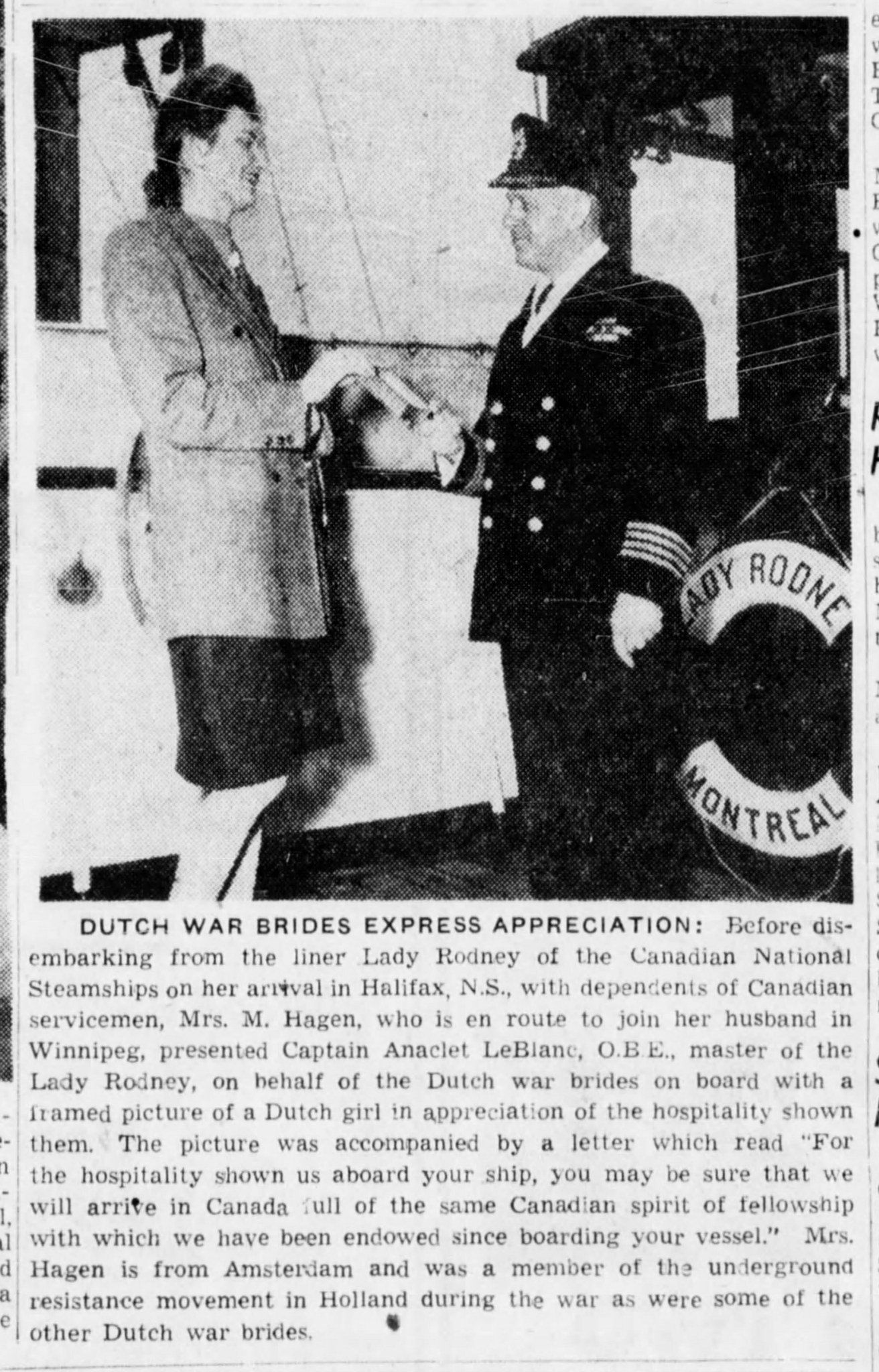 (LR001) Dutch War Bride Edith (née Kool) Hagen expresses her gratitude to the Master of the LADY RODNEY Rodney before disembarking (LR002) War brides enroute to Canada on board the LADY RODNEY - 1946 // Aartje Marie Brauner (nee VanDeventer) from Zeist, Netherlands is furthest on the right in the dark clothes. She married Lester William Brauner who was from Birch River, Manitoba. Lester Brauner was in the Canadian Army and part of the Liberation of Holland. They lived in Sheridan, Manitoba after the war, then farmed in the Birch River area. // From the collection of Aartje Marie Brauner // Courtesy of Kathy Fogh (LR003) Article on LADY RODNEY being returned to CNS Ltd // Montreal Gazette 08 Nov 1946